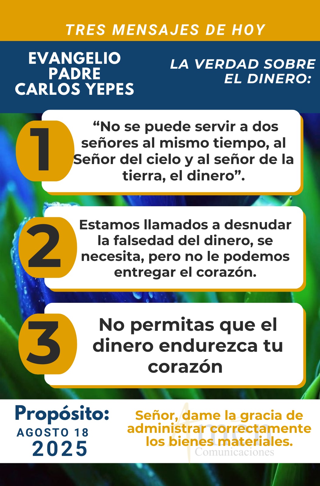 TRANSLITERACIÓN REFLEXIÓN PADRE CARLOS YEPES ¡Dinero! El evangelio de hoy y mañana presentados en el capítulo 19 de san Mateo, nos alertan sobre la realidad de las relaciones enfermas del hombre con las posesiones materiales, con el dinero. Se nos presenta el diálogo del joven rico en posesiones con Jesús, que a la pregunta, ¿qué ha de hacer para heredar el Reino de los cielos? Jesús le responde invitándolo “a cumplir todos los mandamientos”. El joven con alegría reconoce que ha obrado rectamente, ¿qué más tiene que hacer? Jesús le dice: “Vende los bienes materiales que tienes y dalos a los pobres, así tendrás un gran tesoro en los cielos”. Pero nos dice el evangelista, “que el joven se marchó entristecido porque estaba muy apegado a sus bienes”. Sobre este evangelio reconocemos, que a ninguna realidad creada Jesús le da el título de señor como al dinero. En efecto, en otro texto semejante afirmará: “Que no se puede servir a dos señores al mismo tiempo, al Señor del cielo y al señor de la tierra, mammón, mamona, el dios dinero”. Jesús reconoce la poderosa fascinación, el poder de seducción que ejerce el dinero sobre el corazón humano, de alguna manera creyendo que es la ruta para ser feliz, para ser exitoso en la vida. Hoy reconocemos que por amor desmedido al dinero: se vende el cuerpo, se prostituye, se traicionan a los amigos, se finge amor en los matrimonios, se vende la conciencia, se genera corrupción, se ahoga el ser humano en la empresa, en el banco, en la contratación pública, se genera violencia, robos, homicidios, extorsión, trata de personas, venta de armas, secuestro, narcotráfico; todo tiene su raíz en el amor enfermo, el amor patológico al dinero, el falso dios de esta tierra. Hoy reconocemos de alguna manera, que estamos llamados a desnudar la falsedad del dinero, se necesita como lo hemos dicho en tantísimas ocasiones, nadie lo niega, pero no le podemos entregar el corazón. Hoy admiramos las personas que con sabiduría administran los bienes terrenales y también reconocemos que aquella persona que se deja poseer se deja hipotecar en su ser por la riqueza, de alguna manera carga una maldición para sí. Hoy descubre en una primera condición que el dinero muchas veces no enriquece, empobrece al hombre, lo vuelve receloso, desconfiado, suspicaz frente a los demás, empobrece sus relaciones humanas, porque su Dios se ha constituido sobre las posesiones materiales. En una segunda característica, descubrimos que el dinero endurece el corazón. A veces nos hacemos impermeables frente a la necesidad, la precariedad, el sufrimiento del pobre, nos hacemos insensibles ante él y con falsos argumentos racionales decimos: “No le doy dinero porque se le vuelve vicio”, “No le colaboro porque es apoyar la pereza para trabajar”. Racionalizamos nuestra insensibilidad o incapacidad para ser solidarios con los demás, endureciendo nuestro corazón. Reconocemos en una tercera característica que el dinero envilece, vuelve al hombre tacaño en extremo, mísero por el centavo, explotador de la necesidad del otro. Recuerdo un santo sacerdote que afirmaba: “Nunca regatees el precio de la venta de un bien que tiene el pobre, al pobre no se le regatea el precio”. Cómo vamos a grandes boutiques, famosos almacenes de marca y pagamos altísimas sumas de dinero por una prenda o por cualquier otro artículo sin regatear, porque nos parece que no está bien hacerlo. Pero a un pobre que vende en un semáforo de las grandes ciudades de nuestra América Latina, vende una fruta, le regateamos el precio, no nos dejemos envilecer. Continuaremos con esta reflexión mañana, a propósito de tener sabiduría para administrar el dinero. Que el Señor te bendiga abundantemente en este día. En el nombre del Padre y del Hijo, y del Espíritu Santo. Amén.