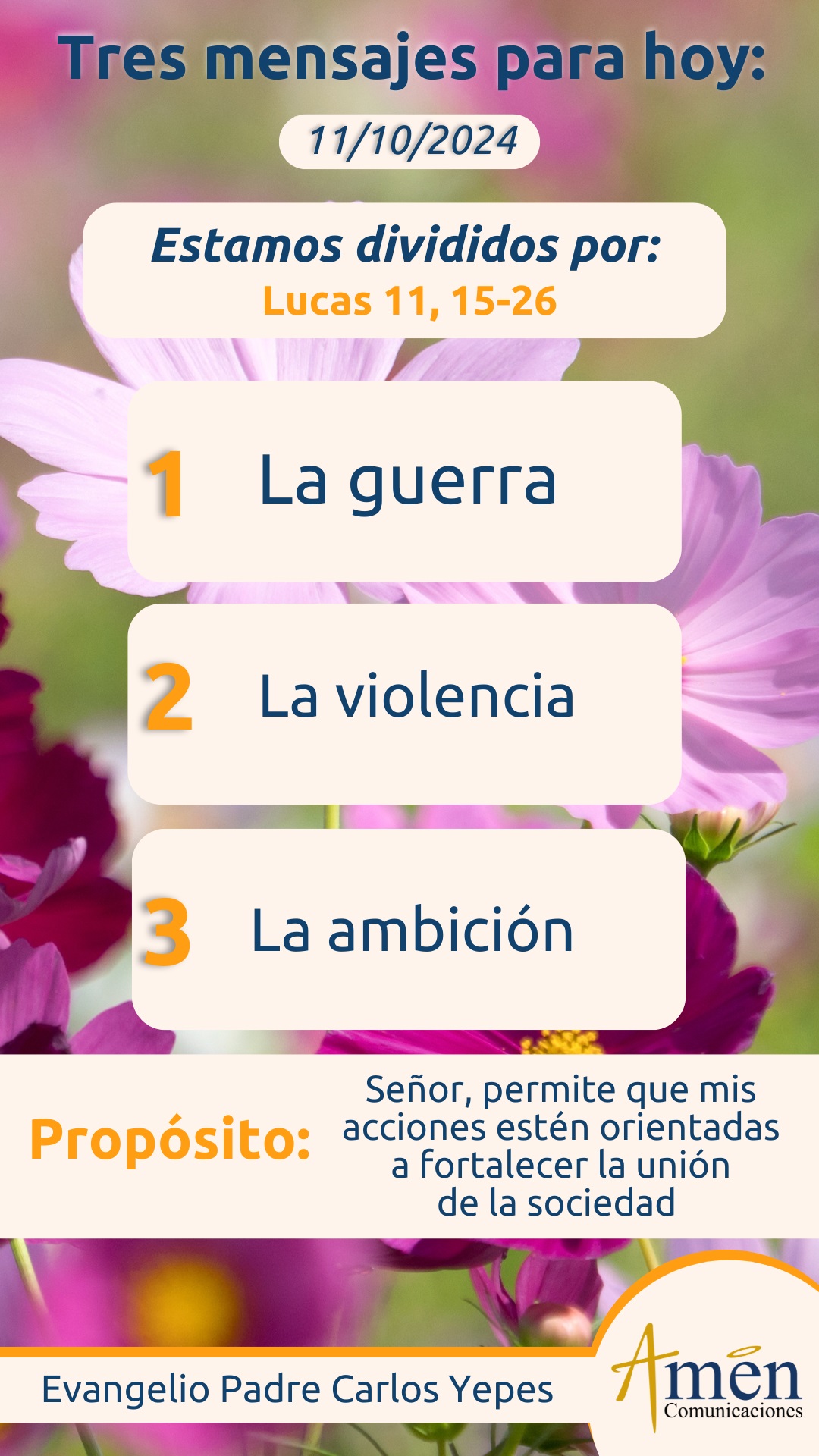 Hoy pregúntate, si en esta lucha contra el mal, contra la mentira y la manipulación que observamos en tantas personas, instituciones, estructuras y medios de comunicación, si nosotros estamos del lado de Dios, de la verdad, de la luz, o estamos del lado de beelzebú, de la oscuridad, de la mentira. Hoy te invito para que replantees tu vida y no son las divisiones, los discursos de odio de algunos gobernantes, enfrentando hombres contra hombres, mujeres contra mujeres, hombres contra mujeres, mujeres contra hombres, ricos contra pobres, pobres contra ricos, empleados contra empleadores, empleadores contra empleados, jóvenes contra viejos, viejos contra jóvenes. En un ser humano que busca dividir, polarizar, confrontar mediante el discurso del odio, del resentimiento, hay clara manipulación, hay clara acción del poder del mal, pero no está la verdad. La gran diferencia entre la Iglesia y muchas ideologías que dicen buscar la justicia, que dicen buscar la igualdad, que dicen buscar el bien para todos, es que la Iglesia y el evangelio en que se inspira la Iglesia busca todo este ideal humano del Reino por el camino del amor, del perdón y la fraternidad, y algunos líderes del mundo, gobernantes, y algunos ideólogos e ideologías, buscan este camino de justicia y de reivindicación social a través de la violencia, a través de la confrontación, a través del resentimiento y del odio humanos. Nada más lejano al mensaje del evangelio, nada más lejano al mensaje del Reino de los Cielos, que el odio, la división, la confrontación, que como señala muy bien Jesús: “Al final termina destruyendo al hombre y llevándonos a todos a la ruina”.