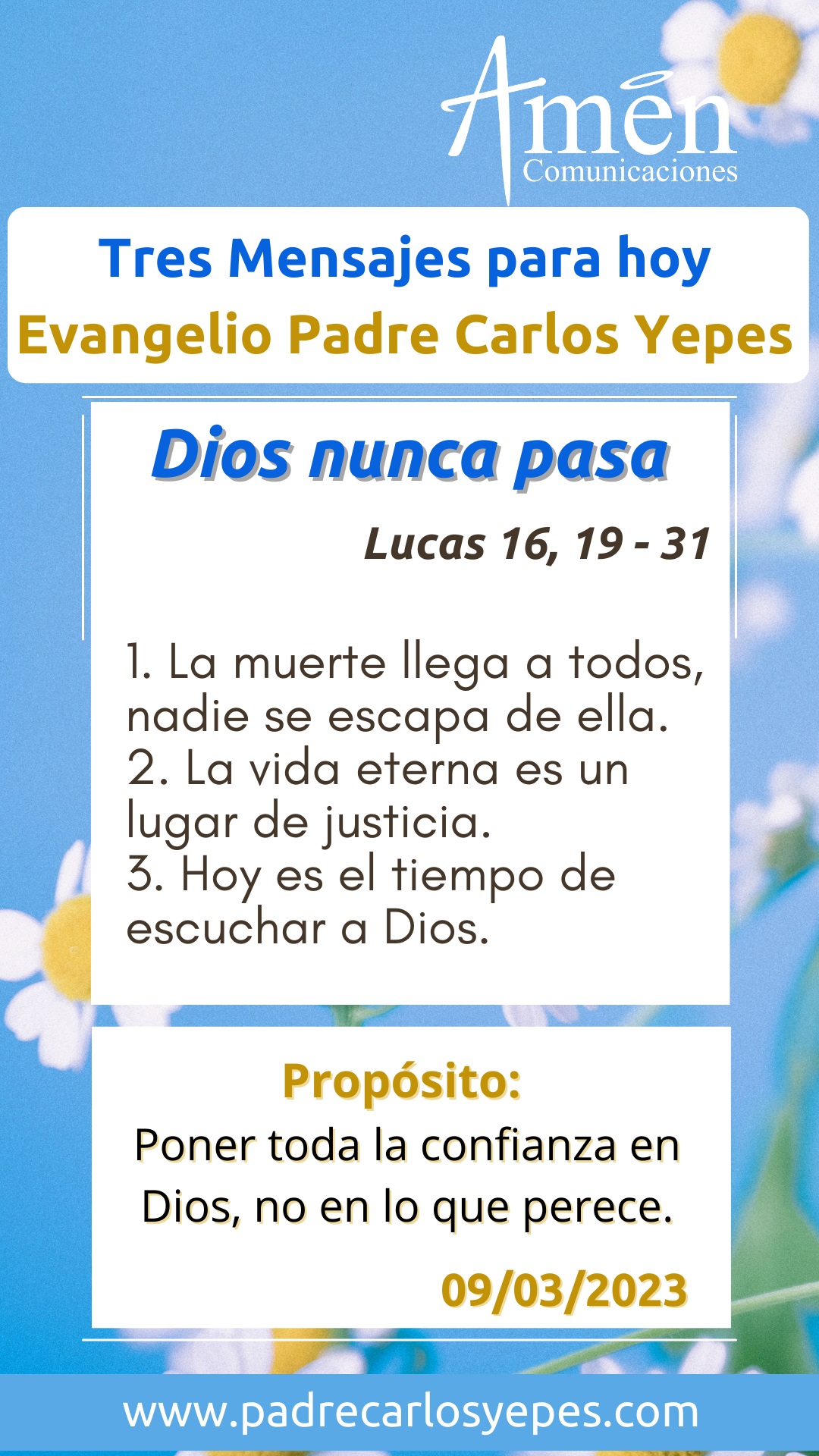 Hoy descubramos como el mensaje central de este evangelio, precisamente el llamado que Dios nos hace, todos vamos a morir uno, hay un lugar de premio y de castigo o un espacio o un tiempo, una dimensión de premio y de castigo para todos dos, y tres hoy es el tiempo de escuchar a Dios, en la ley de Moisés en los profetas y sobre todo en Cristo Resucitado. No endurezcamos el corazón y no pongamos toda nuestra confianza en los bienes del mundo que no nos darán la salvación del alma, pongamos toda nuestra confianza solo en Dios.