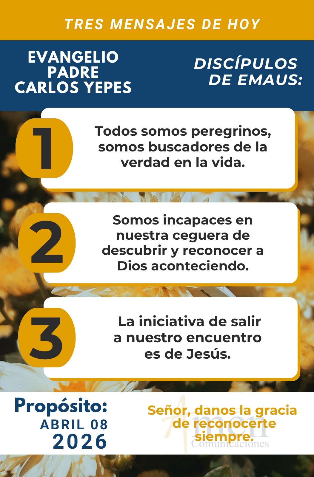 TRANSLITERACIÓN REFLEXIÓN PADRE CARLOS YEPES ¡Quédate con nosotros! (Emaús) Uno de los más hermosos y profundos textos sobre el misterio de Jesús Resucitado es el que nos presenta hoy el Evangelio de san Lucas en el capítulo 24, cuando Cristo presente en la Palabra, en la Eucaristía, en la comunidad de manera pascual, hace pasar a sus discípulos del desánimo a la esperanza. Y en una explicación paciente de la Palabra y las profecías les invita a alcanzar la luz, más allá de que ellos, Cleofas y su amigo se sienten solos y le dicen a Jesús espontáneamente “Quédate con nosotros, que cae la tarde sobre nuestra vida”. En este sentido, podemos decir que Emaús es la más hermosa catequesis sobre el misterio de Cristo Resucitado, que Emaús es la fotografía del hombre de hoy, que a veces, bajo el signo de la derrota, regresa a su antigua vida sin descubrir que Cristo Resucitado camina con él, y se trata de desandar estos senderos o caminos errados que hemos vivido todos para regresar a la vida nueva. Hoy te invito para que, en 12 pasos, como 12 eran los discípulos, reconozcamos grandes sabidurías para nuestra vida. Primer paso. Todos, ayer, hoy y siempre somos peregrinos, somos caminantes, somos buscadores en la vida de la verdad. Es que caminar es vivir, vivir es caminar. Pero en un segundo paso. Todos estamos llamados a devolvernos a nuestro pueblo, a Emaús, a la vida habitual. Es la tendencia natural volver a lo mismo, como lo hizo Cleofás y su amigo, después de estar en el centro de la fe, que era la ciudad de Jerusalén, donde se había dado el acontecimiento más grande de la historia, la Resurrección de Cristo. En un tercer paso. Reconocemos que vivimos como ciegos y somos incapaces, abrumados por nuestros problemas, por nuestros compromisos del día a día, somos incapaces en nuestra ceguera de descubrir y reconocer a Dios aconteciendo, actuando, caminando a nuestro lado en la vida diaria. En un cuarto paso. Vemos como Jesús en persona se acerca, se hace el encontradizo, sale a nuestro paso, camina con nosotros, la iniciativa es de Él. Mira que lindo: Primer paso. Todos peregrinos. Segundo paso. Por ley natural queremos volver a lo mismo de siempre. Tercer paso. En nuestra ceguera, somos incapaces de reconocer a Jesús en nuestra vida. Cuarto paso. Jesús se hace el encontradizo con nosotros. En un quinto paso. Jesús reconoce la tristeza de estos dos peregrinos, están abatidos, desilusionados, desencantados, decepcionados porque piensan que el mal, la muerte, la mentira ha triunfado sobre el bien, la verdad y la vida. ¿Acaso a ti y a mí, ante las adversidades y pruebas de la cotidianidad, no nos ha pasado lo mismo?, ¿acaso tal vez no es tu estado de vida hoy donde te encuentras decepcionado, abatido, desilusionada, desencantada porque las cosas no han resultado como tú pensabas, porque crees que Dios no está caminando a tu lado? Y en un sexto paso. A la pregunta de Jesús sobre ¿qué conversan? Ellos de manera ingenua e ignorante, dirán: “Pues Tú eres el único forastero en Jerusalén. ¿No sabes, que no sabes lo que ha pasado en este fin de semana allí en la gran ciudad?” ¡Qué ironía! Los que supuestamente sabían lo que había acontecido eran ignorantes sobre la Resurrección de Cristo, y el supuestamente ignorante, el peregrino anónimo que está con ellos sí sabía. Hoy te diré que la mayor ignorancia que hay en nosotros es creer que nos las sabemos todas, que no tenemos que aprender de nadie. En el fondo manejamos una fe teórica, hablamos de Jesús como un profeta poderoso en obras y palabras. Pero no creemos que sea el Mesías de Dios, el Ungido de Dios, el que ha transformado la historia humana, que ningún hombre se le puede comparar o equiparar por más que algunas filosofías pretendan hacerlo. ¿Somos como estos forasteros de Jerusalén?, ¿somos como estos peregrinos camino de Emaús, ignorantes? En un séptimo paso. Encontramos que Jesús les dirá: “Duros de entendimiento, ¿ustedes no sabían que era necesario que el Mesías de Dios, el Enviado de Dios, sufriera, fuera crucificado, fuera señalado y sacrificado para poder entrar en la gloria de Dios, en una dinámica pascual? ¿Primero, morir a nosotros mismos, para luego resucitar a la vida plena?” Pero este dolor escandalizó a Cleofás y su amigo, escandalizó a los discípulos de regreso a Emaús y nos ha escandalizado a nosotros a lo largo de la historia. Cuando vemos dolor, adversidad, sufrimiento, maldad, violencia, pensamos que Dios nos ha abandonado, que no está con nosotros, que se ha olvidado de nosotros. No es verdad. En un octavo paso. Persiste la duda de estos dos peregrinos. “Es que nosotros esperábamos (le dirán a Jesús sin reconocerlo, ellos creen que Jesús ha muerto, dudan desde su fe). Nosotros esperábamos, esperábamos que Él fuera el Mesías”. Pero ellos están desanimados, por más que las mujeres de Jerusalén les han hablado de los ángeles, por más que algunos discípulos han dicho que lo han visto, este par de peregrinos de regreso a Emaús dudan y no son capaces de reconocerlo. Jesús, después de explicarles las Escrituras y estar con ellos a lo largo de la tarde, hace ademán de irse. Y en un noveno paso encontramos. Que ellos, algo, algo de luz tenían en su corazón, algo reconocen la presencia maravillosa de Jesús cuando le dicen este par de caminantes al extraño compañero de camino: “Quédate con nosotros, que llega la noche”. Quizás el temor a la oscuridad, quizás un miedo interior, quizás decir con otras palabras te necesito, nos has hablado con verdad. Y viene un décimo paso cuando ellos hacen la reflexión. ¿Acaso no ardía nuestro corazón cuando nos hablaba de los profetas del Antiguo Testamento?, ¿cuándo nos explicaba la Escritura?, ¿cuándo nos decía que Cristo tenía que padecer? ¿Acaso no ardía y encontrábamos verdad en el alma cuando su palabra se hacía vida en nosotros? Y en un decimoprime
