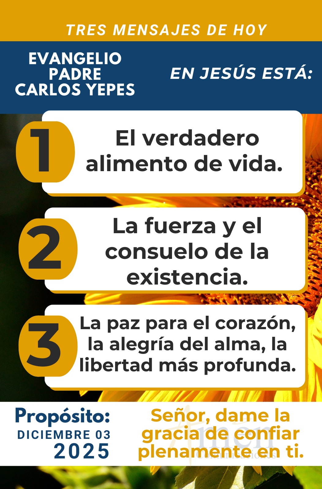 Hoy reconoce que en el Señor está el alimento de vida, la fuerza de la existencia, el consuelo para cada día, la paz para el corazón, la alegría del alma, la libertad más profunda. Y cuando nos alimentamos uno, de la Palabra de Dios. Dos, de la Eucaristía, la comunión diaria. Tres, la visita a Jesús Sacramentado. Cuatro, la fraternidad con los hermanos. Cinco, la caridad con los necesitados. Sentimos que Dios vive en nosotros y estamos dando testimonio que lo más grande que podemos hacer es dar a Dios al mundo y no darle al mundo las cosas meramente del mundo.