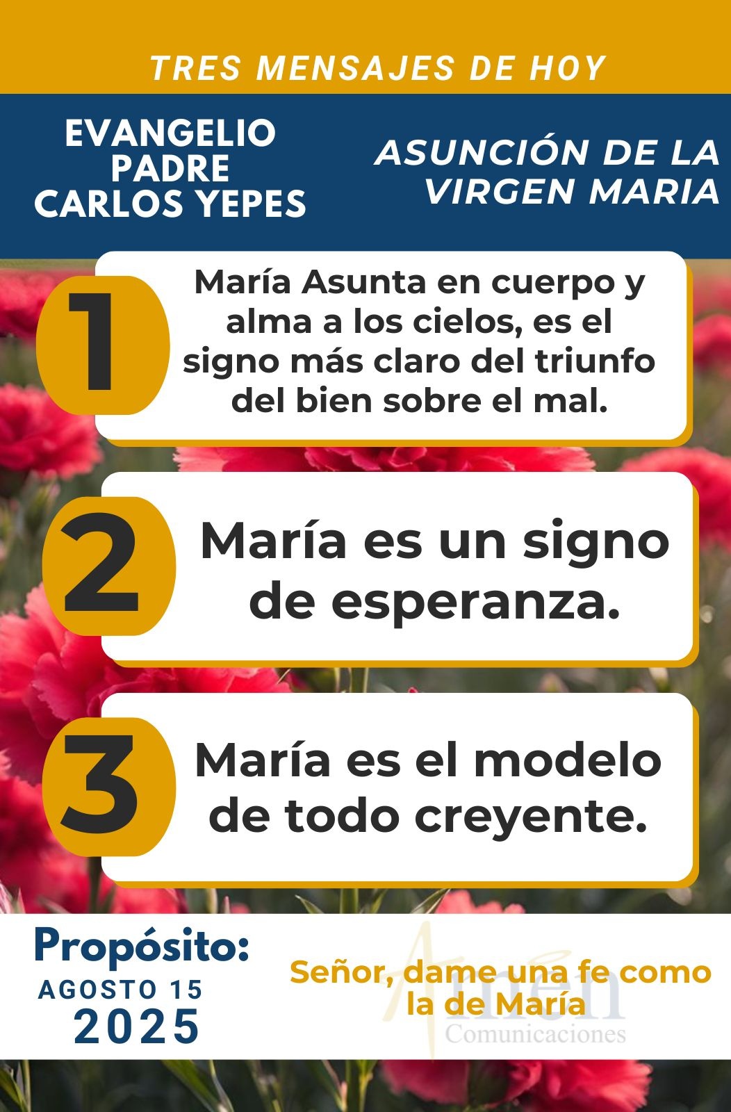 Hoy, cuando a veces experimentas tu vida miserable, sin sentido, vacía, tediosa, una existencia a veces cansina y cansada, aprende a descubrir que la meta final para ti y para mí, si tenemos fe, esperanza y amor en el corazón, es la vida dichosa con Dios en el cielo. Y en esto María, nuestra Madre, ha sido no sólo nuestra gran intercesora, sino el modelo de todo creyente.