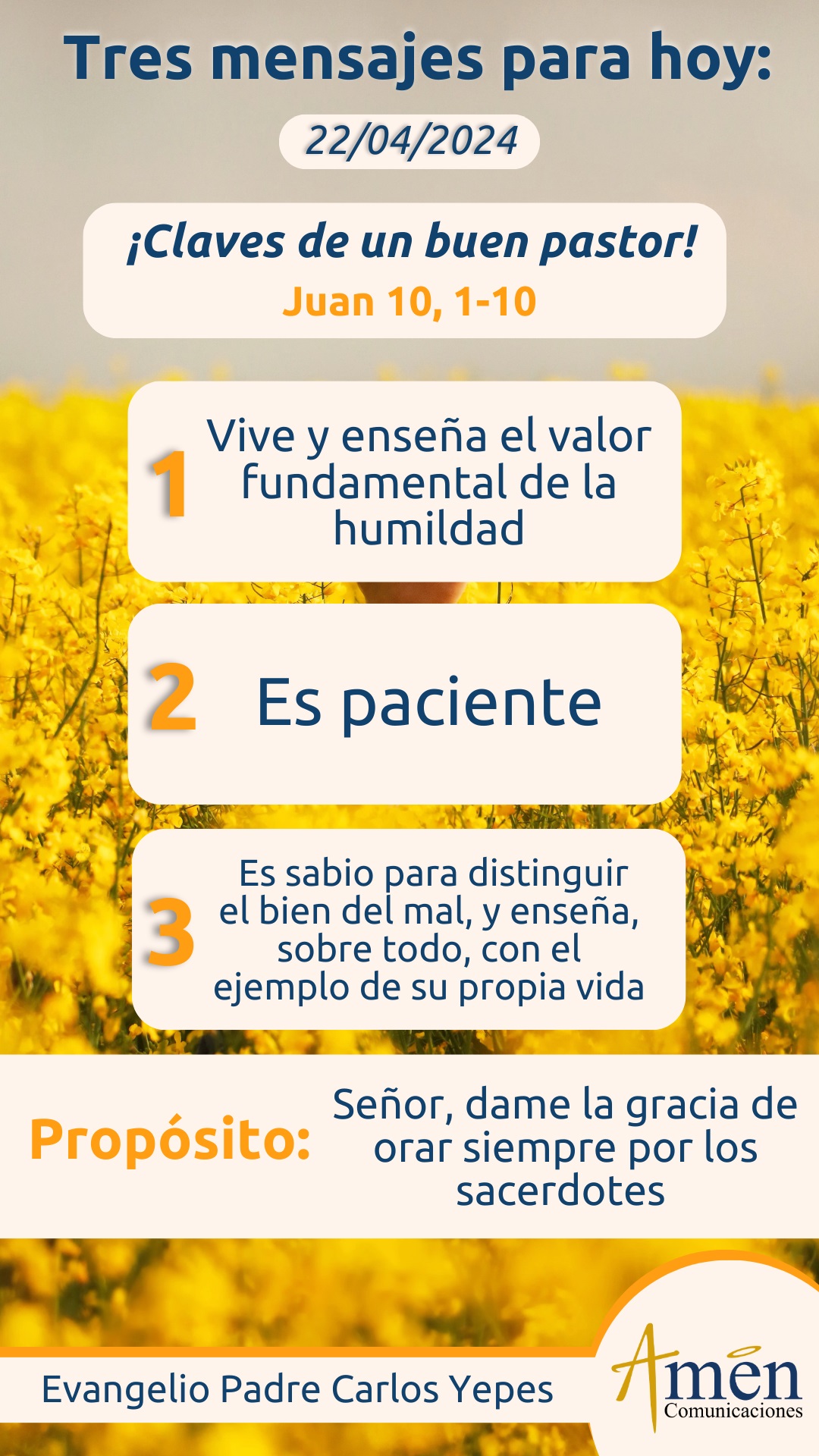 Concluimos con una quinta condición del Buen Pastor y decimos que más allá de la humildad uno, la paciencia dos, la sabiduría tres, la caridad o el amor cuatro, el Buen Pastor debe enseñar sobre todo con el ejemplo de su propia vida. Yo no hablo de impecables, todos nos hemos equivocado, pero una cosa es equivocarnos por debilidad que luego se supera con la gracia de Dios y otra es equivocarse por corrupción. Una cosa es ser malo por un momento de fragilidad personal y otra cosa es ser malo a ciencia, paciencia y conciencia, y permanecer en la oscuridad y en la ignorancia. Te lo repito, no te desanimes si te has equivocado, si no has sido el mejor ejemplo para tus hijos, tus hermanos, tus amigos, tus empleados, tu comunidad, estamos llenos de fragilidad, y así eligió Jesús a sus pastores, los apóstoles, pero si te encomiendas a la gracia de Dios, si entiendes que el barro es parte de nuestra condición humana, darás ejemplo de vida, madurarás con el tiempo y serás una mujer, un hombre ejemplar, que evangeliza y que enseña con su propia vida.