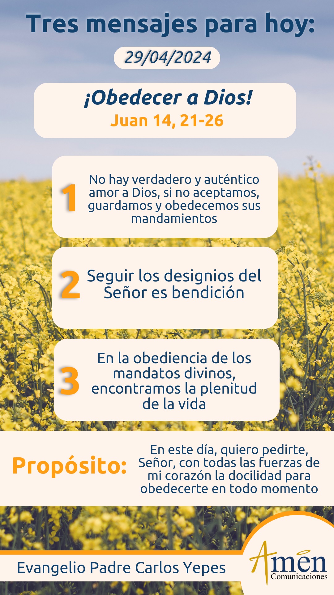 Luego ratifica esto y afirmará: “El que me ama guarda mi palabra, y mi Padre lo amará, y vendremos a él, y haremos morada en él”. Ya no es solamente hablar del amor, sino de que Dios habita en la criatura que vive en obediencia a los mandatos de Dios. Esta habitación, o mejor, inhabitación del Padre, del Hijo y del Espíritu Santo, la ha desarrollado mucho la mística carmelita Sor Isabel de la Trinidad, quien hablaba que por la obediencia a Dios, aún en los más pequeños y simples detalles, se da la inhabitación de la vida trinitaria: el Padre, el Hijo y el Espíritu Santo en nosotros. ¿Qué más grande podríamos esperar en la vida?, ¿hay algo más noble y más hermoso que esto?, ¿que Dios habite plenamente en mí?, ¿que la Trinidad more en mi alma?, y el camino que se nos da en el evangelio de hoy es claro: “Obedece los mandatos de Dios, vive el espíritu de las bienaventuranzas, el decálogo que nos enseñó Moisés en el Sinaí o que recibió en el Sinaí y la Trinidad, el amor del Padre y del Hijo y del Espíritu, habitará en ti, la vida nueva estará en ti”. Es simplemente cuestión de docilidad y obediencia a lo que Dios nos manda en justicia, en solidaridad, en servicio, en perdón, en definitiva, en amor a los demás que es su gran precepto, su gran mandato.