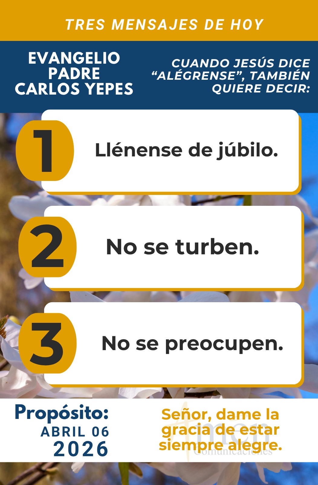 Hoy miles de años después, Jesús nos dice a cada uno en este lunes de Pascua: ¡Alégrense, llénense de júbilo, no se turben, no se preocupen!