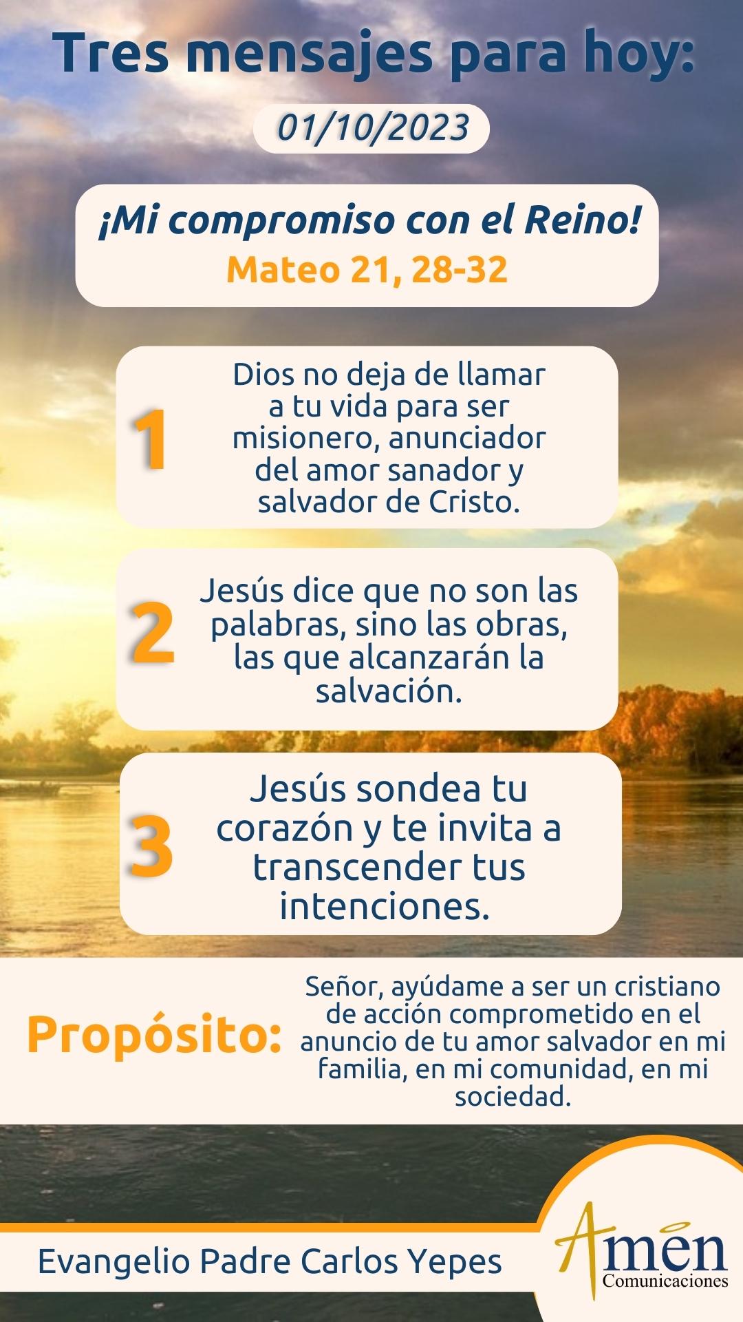Es una invitación el evangelio de hoy, a salir de nuestra falsa comodidad religiosa: ¿voy a misa?, ¿pago el diezmo anual en mi parroquia?, ¿leo ocasionalmente la Sagrada Biblia?, ¿comulgo la Eucaristía con alguna frecuencia?, ¿leo una que otra vez un salmo?, ¿he participado en matrimonios y bautizos de familiares?, y a partir simplemente de un culto sacramental o exterior, nos sentimos justificados ante Dios y mejores que los otros hombres. Jesús nos sacude, y nos dice que no son las palabras, ni las falsas seguridades rituales, las que le van a ganar a un hombre la salvación; es la vida concreta de justicia, son los frutos de santidad, es el trabajo en el viñedo no con palabras sino con obras, las que alcanzarán para nuestra vida la salvación.