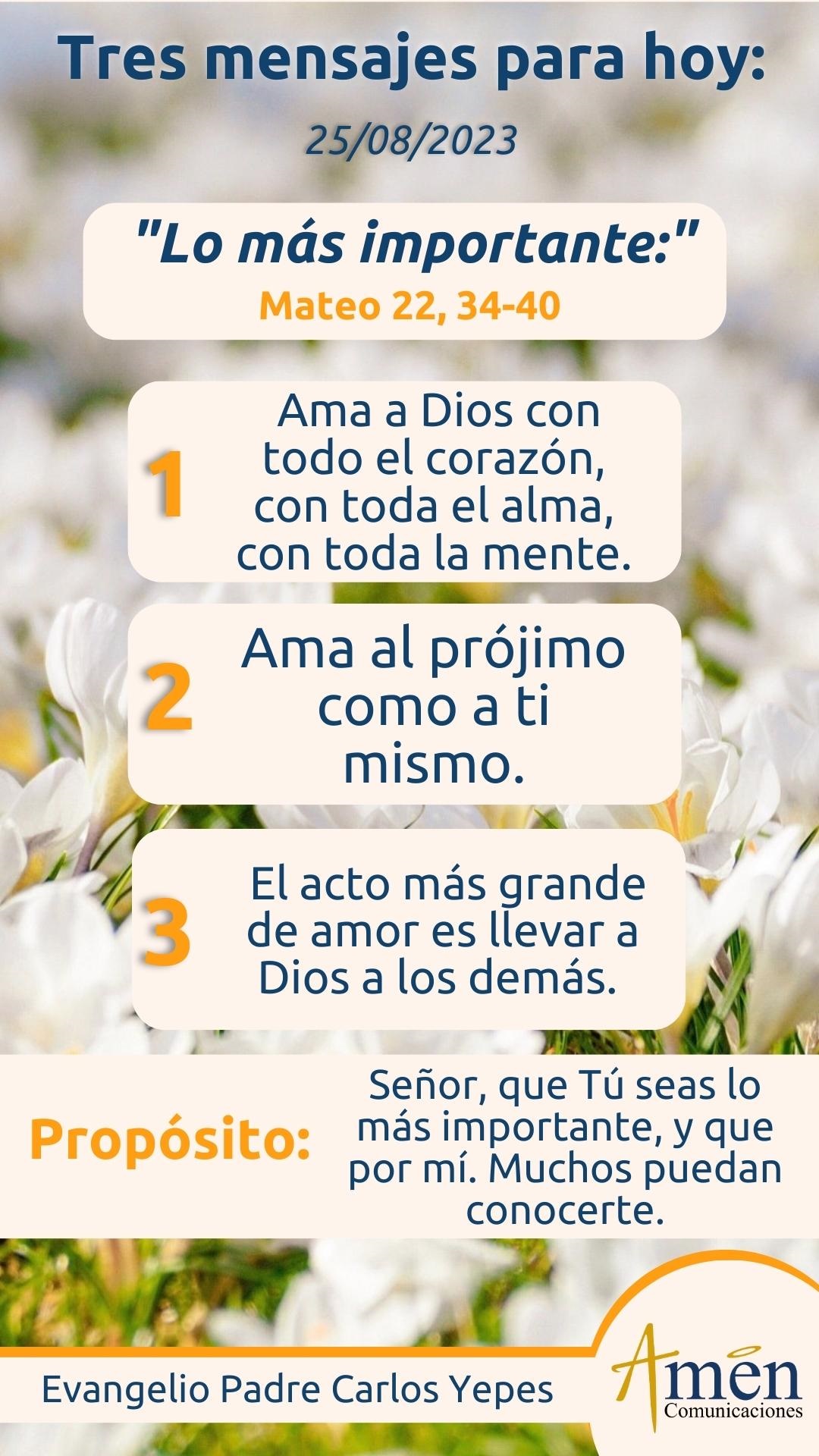 Hoy, en un mundo de tanto egoísmo, de mucha superficialidad, donde la materialidad de la vida parece consumirnos y consumarlo todo, tenemos que reconocer una vocación trascendente, una misión más alta que la de simplemente comer y beber, jugar, disfrutar, dormir y morir. Nuestra misión, a diferencia de nuestras mascotas, es la de trascender y solo se trasciende por la fuerza del amor. En la vida sólo hay sentido cuando amamos, de hecho como lo hemos afirmado en otras oportunidades, cuando Dios ocupa el primer lugar en nuestro corazón, cuando lo amamos a Él con todas nuestras fuerzas, sufrimos menos, vivimos mejor por la sencilla razón de que no colocamos como centro de nuestra vida nada del mundo que pasa, que se acaba, que termina y por eso nos genera ansiedad y temor; sino que colocamos como eje de nuestra existencia, el amor incondicional e inquebrantable de Dios que no pasa, no termina. Por eso ese primer mandamiento de la ley de Dios, ¡Amarlo a Él con todo el corazón!, es fuente no sólo de plenitud de vida, sino de paz interior y de esperanza, porque como decía el apóstol san Pablo: “Más allá de pruebas y tribulaciones, permanece el apóstol tranquilo, porque sabe en quien ha puesto toda su vida, en quien ha puesto toda su confianza”.