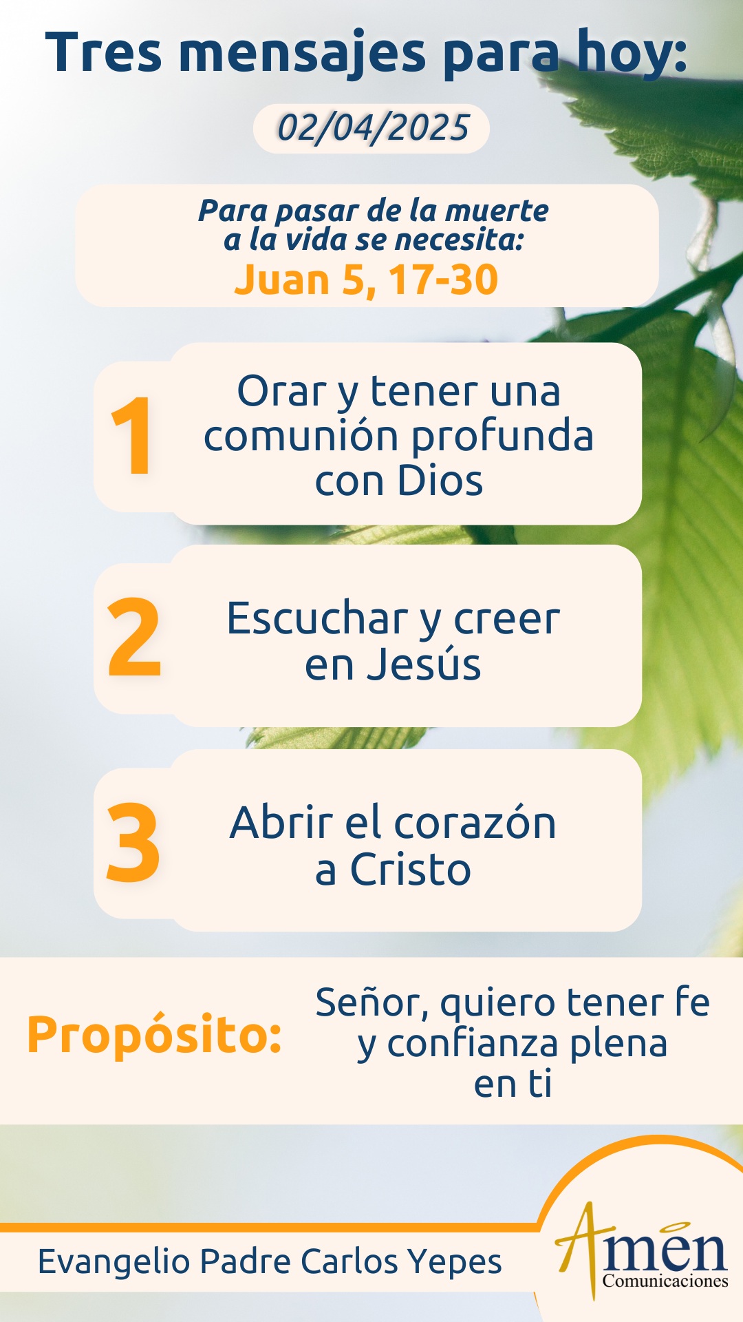 Finalmente, en un tercer momento y también bajo esa forma de seguridad Jesús afirmará: “Les aseguro, que llega la hora y ya está aquí, en que los muertos escucharán la voz del Hijo de Dios y los que la hayan escuchado verdaderamente vivirán”. Solo resucitamos interiormente, dejamos nuestras parálisis, nuestra muerte espiritual, si somos capaces de abrirnos a la vida del Espíritu del Resucitado, que es capaz de renovarnos, restaurarnos en paz, restaurarnos en el amor, restaurarnos en esperanza, restaurarnos en libertad interior. ¿Hoy qué te aprisiona?, ¿hoy qué te roba la paz del corazón?; dile al Señor, quiero escuchar tu voz y quiero creer en ti.