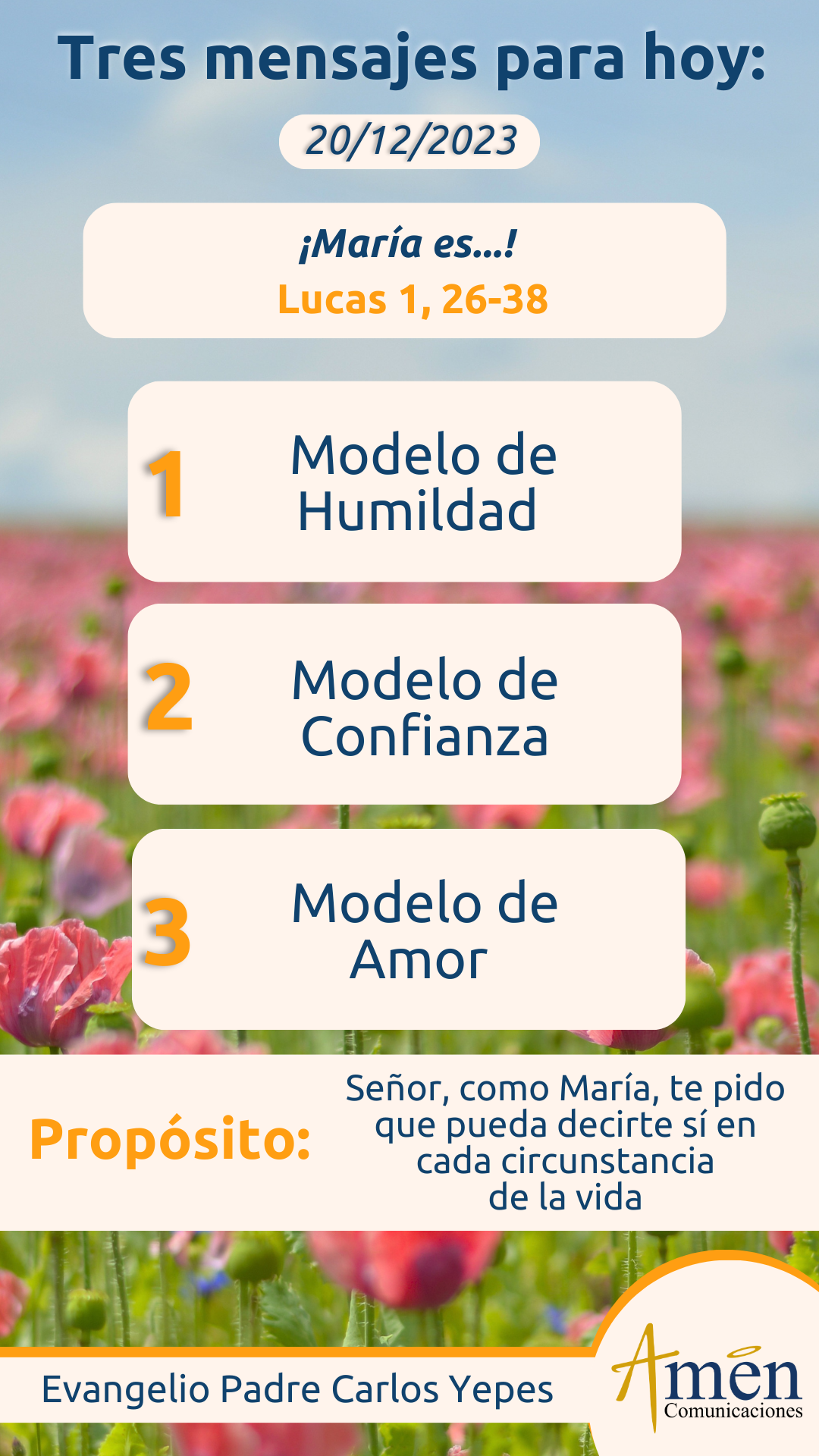 Hoy Señor, te pedimos para el mundo entero, para nuestro país, para nuestras familias y para nosotros mismos, danos decirle sí a Dios en cada circunstancia de la vida, discernir, clarificar, comprender su voluntad sobre nosotros y realizarla como María diciendo: ¡He aquí el siervo del Señor, hágase en nuestra vida, en la vida de todos, según la palabra de Dios!