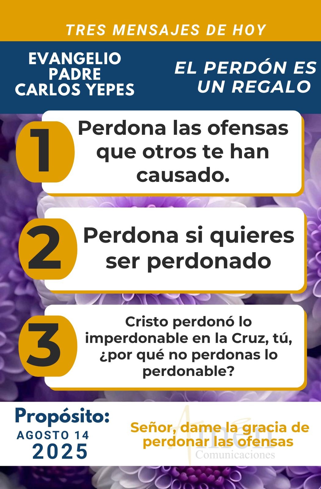 TRANSLITERACIÓN REFLEXIÓN PADRE CARLOS YEPES ¡Perdonar lo imperdonable! El capítulo 18 de san Mateo nos presenta la que es para mí una de las más hermosas parábolas de Cristo a propósito de un mandato universal: “Perdonar, aunque cueste, perdonar, aunque no tengamos motivos y razones de peso para sanar la herida frente a alguien que nos ha lastimado”. Descubramos a partir de esta parábola evangélica, a veces no tan citada por nosotros los predicadores, descubramos como Jesús a la pregunta del apóstol Pedro ¿cuántas veces tengo que perdonar, hasta siete veces? Jesús le exhorta y le deja perplejo con su respuesta: “Pedro, no te digo que perdones hasta siete veces, sino hasta 70 veces siete”. En el fondo es un número simbólico que indica “hay que perdonar siempre y hay que perdonar con plenitud, con la totalidad del corazón. No perdonar de labios hacia fuera, pero con una herida sangrante en el alma”. Descubramos tres hermosas sabidurías o enseñanzas para nuestra vida, a propósito de esta parábola evangélica del rey que perdonó a un súbdito una deuda inmensa de 10.000 talentos. Pero ese mismo súbdito, servidor, no fue capaz de perdonar una pequeñísima deuda de 100 denarios a un compañero que tenía esta deuda económica con él. Primera gran enseñanza, la ley del embudo. Todos conocemos este pequeño instrumento industrial y de uso doméstico en las cocinas, que tiene una boca grande por un lado y muy pequeña por el otro. Así somos nosotros, queremos recibir todo el perdón de Dios, la boca grande por nuestros pecados y ofensas de toda la vida. Pero tenemos una boca pequeña para dar a cuentagotas el perdón por las pequeñas ofensas que otros nos han causado. Esto es un misterio en la psicología y en la condición humana, pero nos encanta rezar en el Padre Nuestro: “Perdona nuestras ofensas”, pero nos da tos o nos cuesta repetir de corazón, “como también nosotros perdonamos a los que nos ofenden”. Hoy, nunca olvides esto, tiene que haber una ley de equivalencia. Si pido un perdón abundante y lo espero del Padre Dios por mis ofensas, que haya también de mi parte un perdón abundante por las ofensas que otros me han causado. No sientas, no es verdad que las ofensas que otros te han generado son más graves que las que tú has ocasionado en el alma de tus semejantes. Estamos llamados todos a perdonarnos y no hay otro camino que proponga el evangelio, porque o vivimos amargados o con rencores, imposibilitamos la vida de Dios, la inhabitación del Espíritu Santo en nosotros. Pero hay una segunda enseñanza y es más definitiva: “Perdona si quieres ser perdonado”. No es simplemente quedarnos en la ley del embudo, sino, como decíamos ahora a propósito de la oración del Padre Nuestro, ninguno de nosotros puede pretender que Dios le perdone si de corazón no ha perdonado a los demás. Acaso no termina así la parábola evangélica cuando el rey, imagen de Dios, indignado con el siervo al que le perdonó una suma impagable, 10.000 talentos (que al cambio actual serían miles de millones, una suma imposible de conseguir para cualquier asalariado normal). Y le dice: “Siervo malvado, una deuda tan grande, el pecado de toda tu vida te lo perdoné, ¿no debías tú también perdonar a tu hermano, a tu amigo, a tu compañero, como yo lo hice contigo? Y dice “que el rey lo hizo meter en la cárcel y mandó llamar a los verdugos”. Y termina la parábola diciendo: “Lo mismo hará con ustedes mi Padre del cielo, si cada cual no perdona de corazón a su hermano”. Hoy lo repito, como en muchas ocasiones lo hemos meditado en estas reflexiones diarias. No guardes rencor frente a nadie, no mires si la otra persona en atención a las graves ofensas que te ha causado merece o no tu perdón, tu misericordia. No lo mires por ese lado, porque quizás no perdonarás. Piensa, yo perdono, no por si la otra persona lo merece o no, sino que yo perdono por salud para mí mismo, por paz interior para mí, porque quiero tener y no perder la comunión con Dios. Es que el mundo está lleno de personas amargosas y amargadas, resentidas y endurecidas en su corazón, porque dejaron que un sufrimiento, un conflicto en los años de juventud, de primera adultez, en los negocios, en el amor, en la familia, en las relaciones interpersonales, le endurecieran su corazón. No, aprende de tu pasado, pero no lo arrastres, se te volverá la vida una carga insoportable. La ofensa de hace 15 años déjala en el pasado, no guardes rabias y rencores frente a nadie, que más grave que la ofensa de hace 15 años es el rencor que has alimentado en estos tres lustros por esa persona, rencor que lo único que ha hecho es hacerte daño a ti mismo. Terminemos nuestra reflexión con una tercera y última enseñanza. Cristo perdonó lo imperdonable en la Cruz, tú, ¿por qué no perdonas lo perdonable? Cristo cargó allá en el Gólgota, en la cruz, el pecado de toda la humanidad, los pecados de toda nuestra vida, parece un peso insoportable y sin embargo, Él, por su vida entregada, por su sangre derramada, redimió ante el Padre Dios nuestros pecados, nuestras infidelidades, nuestras mezquindades, nuestras oscuridades. Por qué si Él fue capaz de pagar los 10.000 talentos, una suma impagable y gigante, ¿por qué no puedes perdonar esos 100 pequeños denarios de ofensas que tu hermano, tu primo, tu vecino, tu exmarido, tu exsocio comercial ha generado en tu vida? No vale la pena fastidiarte. Termino diciéndoles que la vida como sacerdote me ha enseñado que los grandes rencores nacen donde hubo primero grandes amores, amores de amigos, amores de esposos, amores de hermanos, amores de familia. No dejes que ese veneno intoxique tu alma, si ya no amas a esta persona, por lo menos no le guardes rencor. No es sano ni saludable para tu vida. Que el Señor te bendiga abundantemente en este día y te conceda la gracia del perdón y la paz para tu corazón. En el nombre del Padre, y del