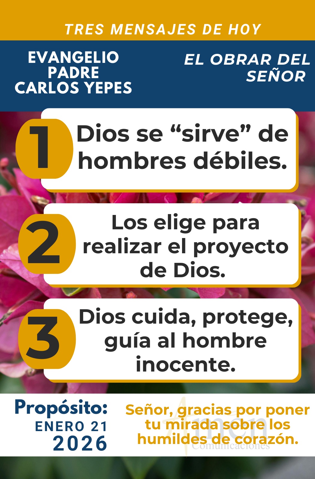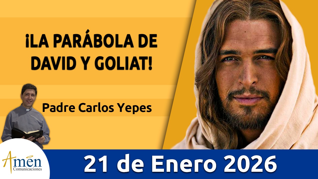TRANSLITERACIÓN REFLEXIÓN PADRE CARLOS YEPES ¡La parábola de David y Goliat! La primera lectura del Libro de Samuel en el capítulo 17, nos presenta el impresionante y conocido pasaje de la batalla entre judíos y filisteos, y concretamente de la contienda entre dos líderes de ambos bandos militares. De un lado, el gigante y temido Goliat y por el otro lado un simple joven que, con una honda, una piedra es capaz de enfrentar a Goliat, se trata del joven David. De este pasaje que todos conocemos, más allá de la desproporción de las fuerzas, descubrimos grandes enseñanzas para nuestra vida. La primera, la lógica de Dios en sus planes, en sus proyectos, siempre ha sido la de servirse de los hombres débiles, pequeños, insignificantes ante la apariencia humana; pero ellos son precisamente los destinatarios para realizar el proyecto, el plan y la obra de Dios en medio de los hombres. Quién pudiera acaso imaginarse, que un joven muchacho, David, sobrado en coraje, entusiasmo y valentía, pero totalmente falto de experiencia y de estrategia militar, es capaz de enfrentar al más temible de los soldados filisteos, destacado por su altura y mirado como un verdadero gigante entre las tropas filisteas, Goliat. Hoy reconozcamos que no es el único caso en los distintos pasajes evangélicos y bíblicos, sino que a lo largo de toda la Sagrada Escritura, encontramos como hombres sencillos como Moisés, mujeres estériles como Ana, la misma Isabel o doncellas vírgenes como María, son los elegidos y las seleccionadas, para realizar la gran obra de liberación de Dios, la gran obra de salvación. Esto nos tiene que poner a pensar a cada uno de nosotros y llevarnos a descubrir, que tus limitaciones, tus defectos, tu timidez, tu falta de carisma, no puede ser excusa, óbice, inconveniente o disculpa para decir, ¿yo qué puedo hacer por la Iglesia?, ¿yo que puedo hacer por mi familia?, ¿yo qué puedo hacer para construir una sociedad mejor? Descubre que Dios se sirve de medios pequeños, insignificantes, para realizar su tarea. Cuando pienso en esta idea, inmediatamente viene a mi imaginación, la imagen inmensa de Benedicto XVI, cuando fue elegido Papa en el año 2005 sin pensarlo. En su primer discurso, presentándose ante el mundo como el sucesor del apóstol Pedro dirá: “Que se siente muy pequeño para la misión altísima que se le ha encomendado, pero que le consuela el saber, que Dios trabaja con instrumentos insuficientes para realizar su obra”. Esta expresión de Benedicto XVI, por demás cargada de humildad, de sencillez y de verdad, es una expresión paradigmática aplicada a cualquiera de nosotros. Tú, más allá de los años de vida que tengas, más allá de tu enfermedad, más allá de tu falta de formación académica en la teología, en las ciencias sagradas, tú puedes ser un gran instrumento de Dios para este momento de la Iglesia, de la sociedad y del mundo. Dios, y así lo señalaba Jesús en los evangelios, nunca buscó a los sabios, a los entendidos, a los sabelotodo y autosuficientes que pululan en todas las generaciones; sino que, por el contrario, buscó personas sencillas que, en su debilidad, sabían confiarse a Dios, como claramente lo afirmará en su momento el apóstol Pablo, en medio de enfermedades, hambres, persecuciones y traiciones, cuando dirá: “Sintiéndome débil, entonces soy fuerte en el Señor”. Pero descubrimos una segunda enseñanza que nos trae precisamente el salmo responsorial del día de hoy, mostrando cómo Dios cuida, Dios protege, Dios guía al hombre inocente en las batallas de su vida y más allá de la conciencia de su propia debilidad. En efecto, dirá el salmo 144: “Bendito el Señor, mi alcázar, mi roca, que adiestra mis manos para el combate, mis dedos para la pelea”. Y está hablando el salmista precisamente, de la contienda de David con el gigante Goliat. Luego dirá el salmista: “Dios es mi bienhechor, mi alcázar, baluarte donde me pongo a salvo, mi escudo y refugio que me somete los pueblos. Dios mío, te cantaré un cántico nuevo, tocaré para Ti el arpa de diez cuerdas, para Ti que das la victoria a los reyes y salvas a David, tu siervo, de la espada del malvado”. Hoy no sientas temor de enfrentar a los malvados de nuestro tiempo, que ha habido y habrá malvados en todas las épocas y en todos los tiempos, pero Dios es tu roca, tu alcázar, tu protector. Terminemos nuestra reflexión mirando brevemente el evangelio de hoy y reconozcamos que cuando Jesús se compadece ante un hombre que tiene una mano paralizada y más allá de que es día sábado de descanso sagrado, quiere sanarlo del dolor y de la incapacidad de movilidad de su brazo; pero los judíos que lo acechaban miran con dureza a Jesús, porque adivinan que va a obrar la sanación en este hombre. Jesús con autoridad les pregunta, ¿qué está permitido en el día del descanso sagrado?, ¿quedarnos impávidos haciendo nada, lo malo?; o ¿hacer el bien a un hombre devolviéndole la vida, la salud o lo dejamos morir? Nos dice el evangelista Marcos, “que todos callaban”. Y Jesús, y es una expresión que nos pone a pensar, echó una mirada llena de ira y dolor, por la dureza de corazón de aquellos contemporáneos y coterráneos judíos que le escuchaban y por encima de su parecer, de su legalismo, esclavitud de la ley del sábado, le dice al pobre hombre enfermo: “Extiende tu mano que te voy a curar”. Los fariseos, lejos de alegrarse, salen inmediatamente de la sinagoga y se confabulan con los seguidores de Herodes (los herodianos), para acabar con la vida de Jesús. Esta es la eterna lucha entre bien y mal; David y Goliat en el Antiguo Testamento, Jesús y los fariseos en el Nuevo Testamento. Y hoy los cristianos, hijos de la luz, sal de la tierra, luz del mundo y los hijos del mundo que te pueden despreciar. Dios siempre será tu alcázar, tu protección y no puedes dejar de hacer el bien, por leyes inicuas, por convencionalismos humanos, po
