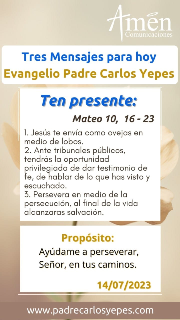 Sólo la perseverancia en medio de las dificultades, la perseverancia que supera desánimos, la perseverancia que supera cobardías espirituales, nos dará la salvación definitiva. Es un evangelio ciertamente fuerte, pero frente a cada uno de los desafíos, Jesús nos da fórmulas centrales, mansos como palomas, astutos como serpientes, uno; tendremos oportunidad de dar testimonio ante los hombres, de la fuerza de Dios en nuestra vida, dos. El Espíritu Santo hablará a través de nosotros, tres, y sólo con nuestra perseverancia, al final, al final de la vida, alcanzaremos el premio de la salvación.