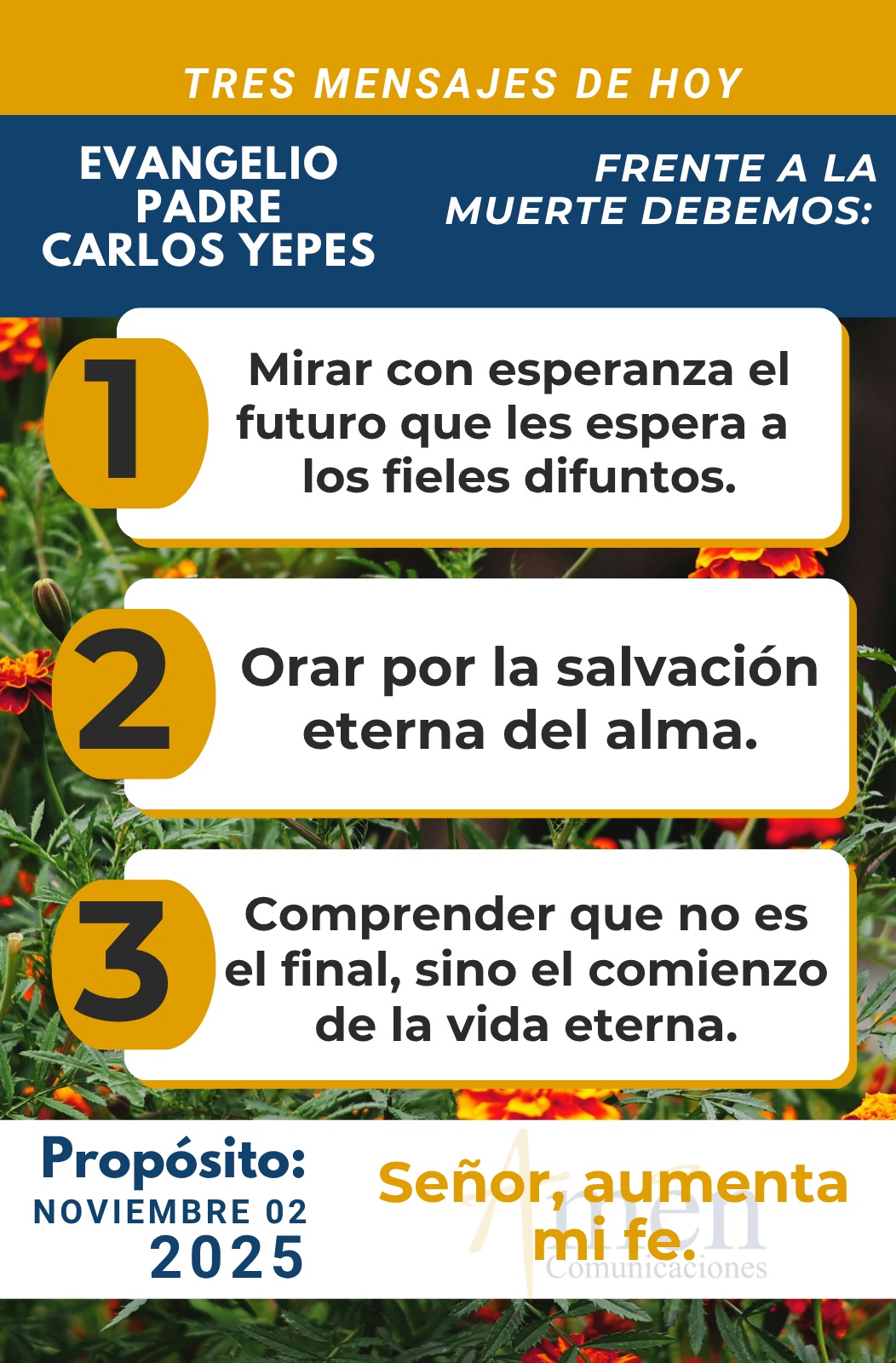 Hoy, agradecidos con el buen Dios por tantos seres amados que han partido pero que nos han hecho crecer en la vida. Hoy, mirando con esperanza el futuro para ellos, más allá del purgatorio, una etapa de purificación en sus vidas y también mirando con esperanza nuestro propio futuro, más allá de la muerte. Y hoy encontrando el consuelo en Jesús, que nos dice “que la muerte no es el final de nada, sino el comienzo de todo, el comienzo de la verdadera vida”, oremos por aquellos que han partido en fe y con devoción. Concédeles, Señor, el descanso eterno y brille para ellos la luz perpetua. Concédeles, Señor, el descanso eterno y brille para ellos la luz perpetua. Concédeles, Señor, el descanso eterno y brille para ellos la luz perpetua. Las almas de nuestros familiares, seres queridos y amigos, y la de todos los fieles difuntos por la misericordia de Dios, descansen en paz. Amén.