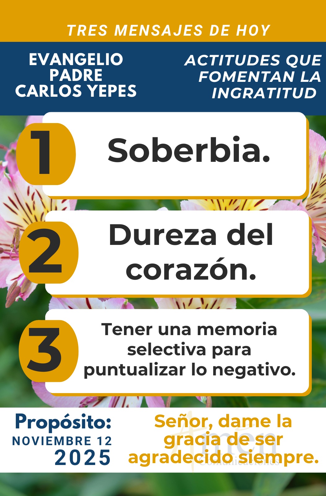 TRANSLITERACIÓN REFLEXIÓN PADRE CARLOS YEPES La primera lectura del Libro de la Sabiduría en el capítulo 6 es una clara advertencia a los poderosos y gobernantes de esta tierra. De manera tajante les dirá: “El poder que ahora ostentan les viene de Dios y la soberanía solo es del Altísimo”. Y lanzará una advertencia en una época de polarizaciones políticas, de gobernantes con aires dictatoriales en distintas latitudes del mundo. Lanzará el buen Dios esta advertencia: “Si no gobiernan rectamente, si no actúan según la voluntad de Dios, si hay abusos de poder e injusticia, les espera un juicio implacable”. Y precisará “al hombre pequeño que no se le ha dado gran poder ni responsabilidad humana, social o política se le perdona por piedad. Pero el poderoso ratifica, será examinado por Dios con gran rigor”. Y concluirá diciendo este texto bíblico que tiene una plena vigencia para nuestro tiempo en el siglo XXI: “Dios no teme de nadie, de ningún gobernante, ni lo intimida la grandeza, pues Él los ha creado a todos”. Pero ratificará a los poderosos de esta tierra “si cometen injusticias y abusan del poder les espera un juicio riguroso”. Con razón podemos decir que hay que orar por los gobernantes para que aprendan sabiduría, para que no se equivoquen, para que vivan en justicia de cara a Dios. Y también encontramos nosotros en el precioso salmo que como asamblea litúrgica decimos: “Levántate, oh, Dios, y juzga la tierra”. En el fondo, es una invitación a pedirle al Señor que, en medio de los atropellos de líderes, de gobernantes, de poderosos de esta tierra, no solamente en el mundo político, sino en el mundo de las grandes transnacionales tecnológicas, que el Señor proteja al desvalido y al huérfano, que haga justicia al humilde y al necesitado, que defienda al pobre y al indigente sacándolo de las manos del culpable. “Y aunque se sientan dioses todos morirán como cualquier hombre. Caerán príncipes como uno de tantos”, afirmará de manera profética el salmo de hoy. Pero pasemos al evangelio de Lucas en el capítulo 17, cuando, a propósito de la sanación de diez leprosos, nueve connacionales con Jesús o judíos, y un extranjero, un samaritano, sólo este último, el extranjero samaritano, se acerca a agradecer a Jesús y Él, extrañado, pregunta ¿dónde están los otros nueve leprosos judíos a los que Él también sanó? Aprendamos tres grandes enseñanzas para nuestra vida. La primera, los leprosos en la Biblia son imagen de la exclusión, de la humillación, de la marginación y del oprobio. Tenían que ser retirados de su familia, ser excluidos de las reuniones en la sinagoga, salir de sus villorrios y pueblos y vivir en cuevas, en los montes. Porque la lepra, una enfermedad contagiosa y la mentalidad de la época, considerada como maldita, un castigo de Dios, los llevaba a esa triple exclusión: familiar, religiosa, de la sinagoga y social, porque eran hombres contaminados, mujeres contaminadas. Hoy nos preguntamos en el siglo XXI, ¿cuáles son los excluidos de nuestro tiempo?, ¿cuáles son los marginados de nuestra sociedad?, ¿cuáles son los mirados con indiferencia en la farándula, en los medios de comunicación, los que no cuentan para nadie? Y pensaría que, aunque los leprosos hoy en día son pocos, hay nuevas formas de leprosos o de exclusión, o de excluidos. Los viejos que son improductivos, los pobres que no pueden acceder a clubes sociales o a ciertos lugares. Los feos y las feas en los estándares de belleza tan alto que han colocado los influenciadores en redes sociales. Los enfermos también improductivos. Los migrantes que los miramos como estorbos en sociedades opulentas y aun los mismos creyentes católicos o cristianos que son tildados a veces como fanáticos, radicales, retrógrados, y porque su único pecado es creer en Dios y no endiosar el mundo y las vanidades del mundo, como por ejemplo el dinero, la belleza, la fama. Hoy en nuestra sociedad pagana cuentan los que tienen riqueza, fama, las lindas y los lindos, los que tienen reconocimiento digital, los sanos, los vigorosos, los jóvenes. Pero otro tipo de personas no cuentan. Cómo Jesús violando cualquier tipo de prohibición cultual, se acercó a los leprosos y los sanó, pidiéndoles, según manda la ley de Moisés, que fueran al sacerdote, la autoridad religiosa para certificar su curación, su sanación y permitir su reinserción en la familia, en la sinagoga y en la sociedad. Pero hay una segunda enseñanza para nuestra vida, y es que la ingratitud le dolió a Jesús. Tan sellado en su corazón, tan prudente en sus palabras, y, sin embargo, se preguntó, imaginamos con algún dolor ¿dónde están los otros nueve leprosos que había sanado?, ¿por qué no ha regresado más que este leproso, extranjero, samaritano a agradecer? Hoy te pregunto ¿eres una persona grata o ingrata?, ¿una persona agradecida o desagradecida? Y pregunto de manera general ¿por qué somos ingratos? Y me doy algunas respuestas que te pido que analices. Somos ingratos por soberbia, porque creemos merecerlo todo, porque nos falta humildad, porque pensamos que sólo tenemos derechos, no deberes. A veces, cuando estamos muy jóvenes en la adolescencia, reclamamos airadamente y con indignación a nuestros padres ¿para qué me trajo al mundo?, ¿para qué me dio la vida? Usted tiene que darme este dinero, usted tiene que darme este gusto, usted tiene que darme este viaje. Un papá sabio le dice a un hijo altanero: “Uno lo único que tiene en la vida es que morirse”. No le digas a tu papá usted tiene que darme este viaje, ¿para qué me trajo al mundo? La soberbia nos hace desagradecidos. La falta de humildad nos hace ignorantes sobre nuestra verdadera condición personal. En una segunda verdad, ¿por qué somos ingratos?, reconozco que por dureza del corazón. Cuando el sufrimiento no se llevó desde Dios, cuando las adversidades de la vida nos amargaron el alm