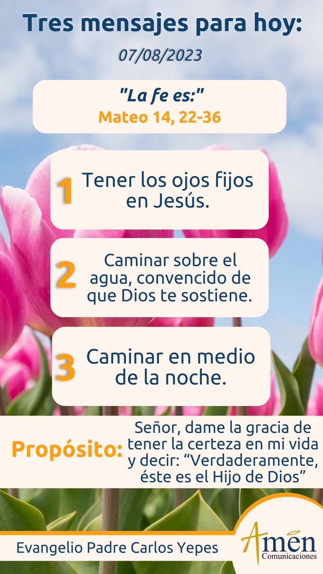 Pero habría un tercer elemento también muy interesante, y es que la fe, a veces es ese caminar en medio de la noche, no había claridad, no reconocían esa figura que caminaba serenamente sobre las aguas del mar de Galilea, lo confundían con un fantasma. Cuántas veces en tu vida dices, no sé hacia dónde voy, no tengo claridad sobre mi futuro próximo y solo puedes confiadamente abandonarte en Dios.