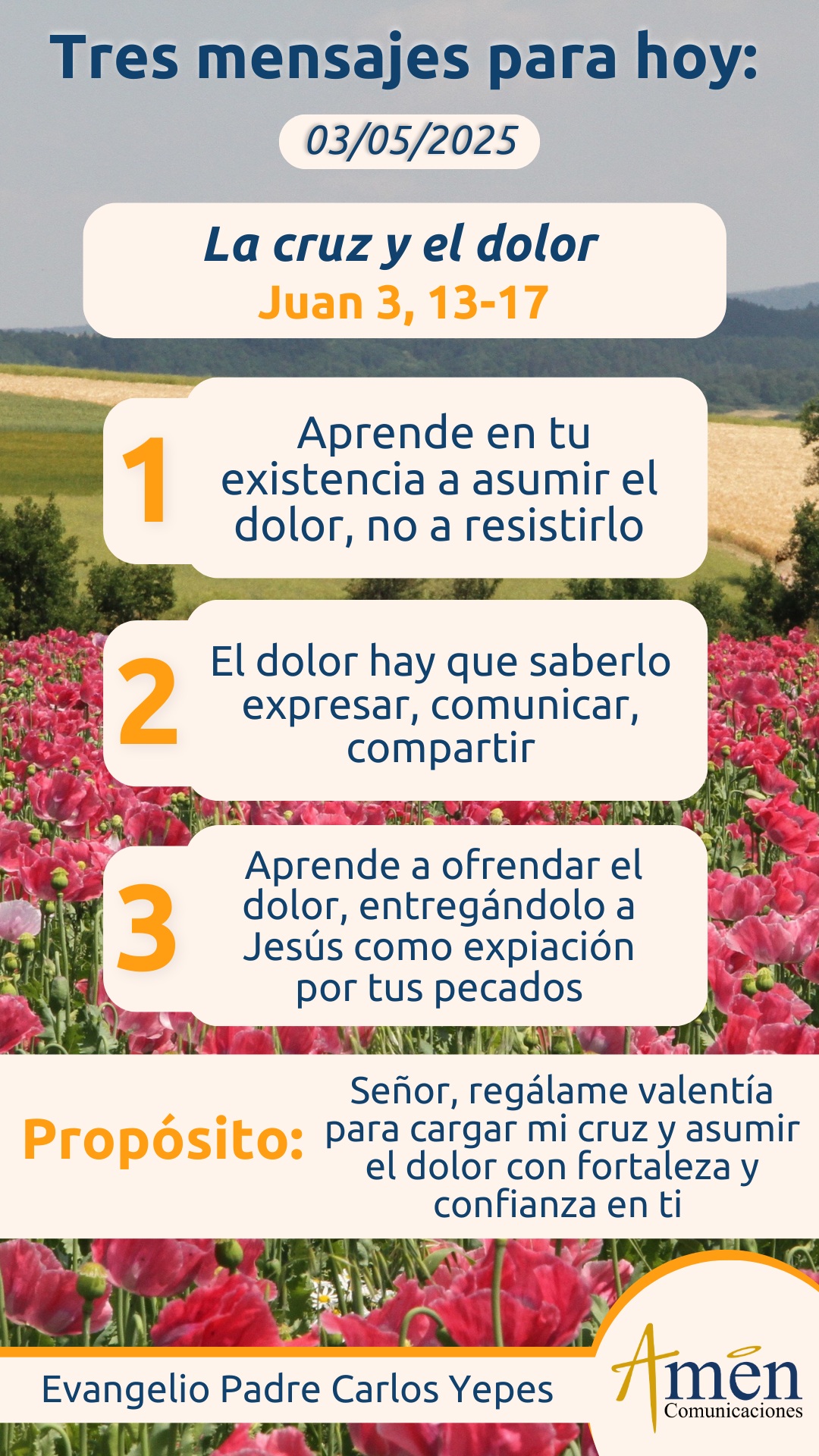 He aquí que viene un cuarto camino y lo podemos decir, el dolor ofrendado hay que saberlo transformar. El dolor no puede amargarte, endurecerte, entristecerte, hacerte escéptico frente a los demás. El dolor transformado por la fuerza del amor nos hace más humildes, más pacientes, más sabios, más prudentes, más confiados en Dios. Mira cuántas bendiciones de una cruz hoy en el día de la Exaltación de la Santa Cruz, por lo menos en nuestro país, cuántas bendiciones ganas en humildad, en sabiduría, en paciencia, en confianza en Dios. ¡Cuánto nos transforma el dolor!, recordando la famosa expresión: “Nadie ha viajado al mundo del dolor y no ha regresado de él, transformado y hecho un mejor ser humano”.
