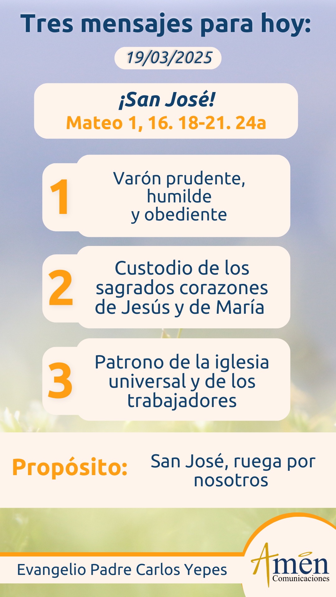 Hoy, en lo personal, agradezco al Señor porque justo en este día 19 de marzo (hace 15 años), nació la productora digital Católica Amén Comunicaciones, (Amén: A, apostolado, M, en los medios, E, evangelización, N, nueva. Apostolado en los medios para una evangelización nueva). Ha sido tantas las gratificaciones, tantas las satisfacciones, tanto el bien realizado en estos 15 años bajo el Patronato de San José que Amén Comunicaciones nace el día de él en 2010 (hace 15 años), que sólo hay motivos de gratitud frente al Santo de los imposibles. Pero también en lo personal, doy gracias a Dios, porque un día como hoy, 19 de marzo (hace 3 años), nace en una diócesis vecina a Medellín, la casa de retiros, la casa de encuentros y de evangelización, Monte María, donde tantas personas han ido a recibir el anuncio del evangelio, han sanado heridas, han encontrado liberación, han profundizado su fe en retiros sobre todo de fin de semana presenciales. A San José ambas obras, nacidas en 19 de marzo (hace 15 años y hace 3 años), y damos gracias solamente a él, porque lo que parecía en lo humano imposible, aún con persecuciones solapadas, con incomprensiones de cercanos, estás dos obras de evangelización: Amén y Monte María han pervivido por la gracia de Dios y la intercesión grande de San José.