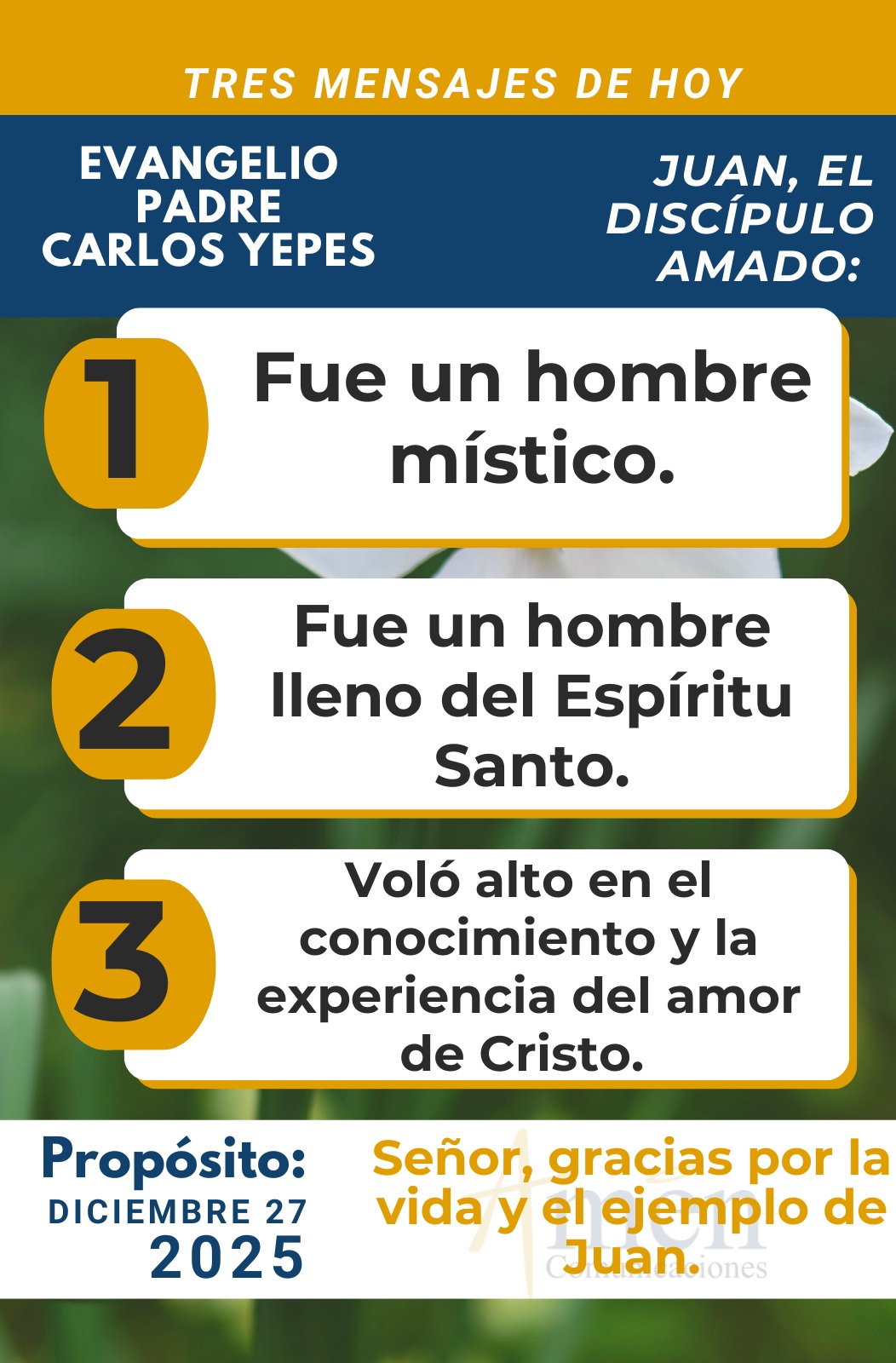 Y es que hablar de Juan, más allá de ser un apóstol o evangelista, es hablar del discípulo más amado por Jesús, del más joven de todos ellos, pero sobre todo del místico, del hombre lleno del Espíritu Santo, que voló alto, muy alto, en el conocimiento y la experiencia del amor de Cristo, a tal punto que se le simboliza a lo largo de dos mil años de la iglesia con el águila, porque las águilas vuelan alto en las montañas, y Juan voló alto en la experiencia del amor de Dios.