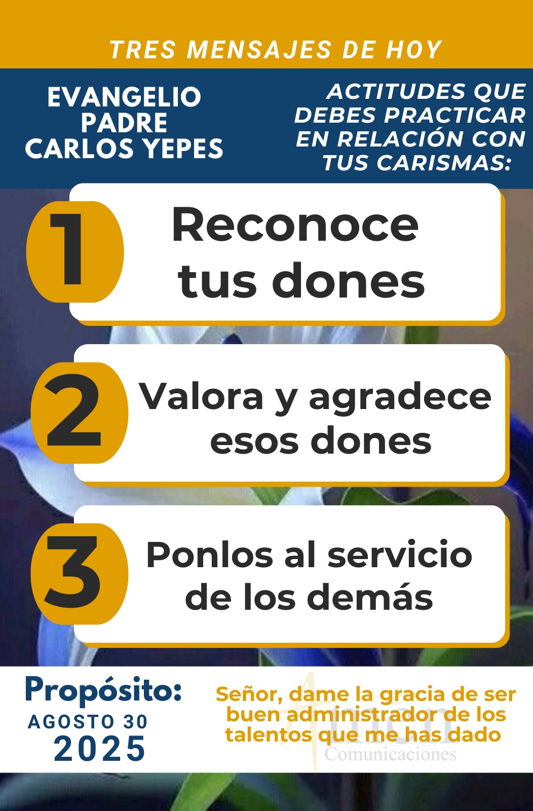 Segundo, valora y agradece esos dones, no se te han dado como bolas en árbol de Navidad, simplemente de adorno para vanidad personal. Reconoce y agradece esos dones, otras personas no los tienen. Ese don para cantar, esa habilidad única en el deporte, ese talento artístico, esa cualidad humana de la prudencia, ese don de gentes, ese carisma de la simpatía. Recuerda que no fuimos hechos en serie, si no en serio, y todos tenemos carismas y dones que uno, identificamos, dos, valoramos y agradecemos al Señor de la Vida porque no tiene obligación con nosotros.