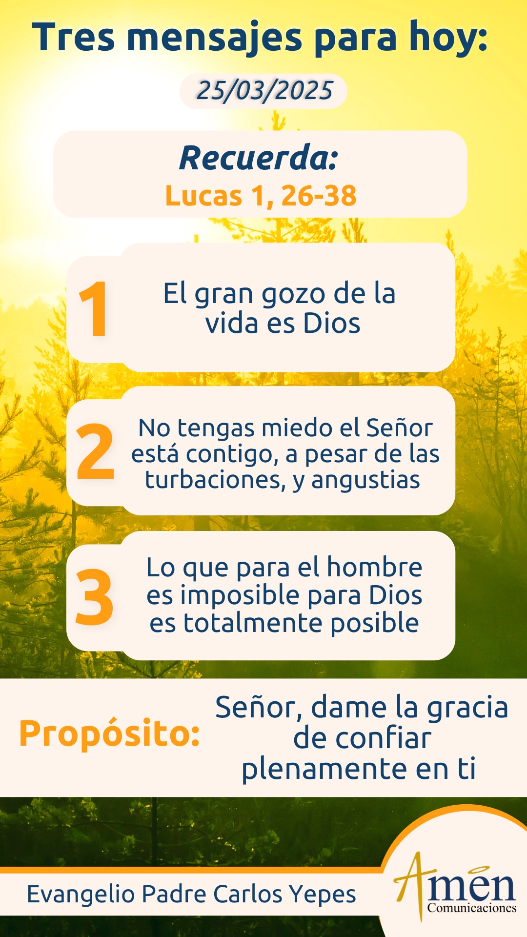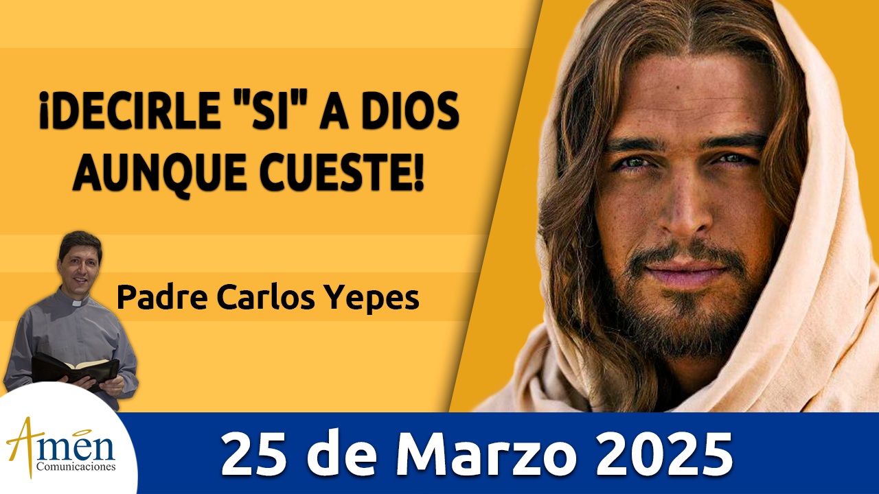 TRANSLITERACIÓN REFLEXIÓN PADRE CARLOS YEPES Con el carácter de solemnidad litúrgica, la Iglesia con gran alegría, celebra hoy la solemnidad de la Anunciación del Señor, y es un día propicio para orar, agradecer la vida de aquellas madres embarazadas, las que han parido recientemente y aquellas que buscan afanosamente el don y la gracia de la maternidad. El precioso texto de Lucas en el capítulo primero nos muestra, el anuncio alegre que hace el arcángel san Gabriel a la Virgen Santísima de que será la Madre de Dios. Pero más allá de este conocido texto mariano ¿qué enseñanzas podremos sacar para nuestra vida de forma práctica, más allá de orar, repito, por las madres gestantes o aquellas que buscan familia y orar por aquellas que han querido en un momento de desesperación abortar su hijo, orar para que no lo hagan? Saquemos cuatro enseñanzas para nuestra vida. La primera, la alegría de Dios en la vida personal. En efecto, cuando el ángel entra en presencia de María, le dice: “Kecharitomene (la expresión griega que significa Alégrate, llena de gracia)”. El motivo para la alegría profunda de María es que el Señor está con Ella, y en grado diverso cada uno de nosotros puede decir que la gran alegría de la vida no es una comida sabrosa, un viaje a las islas griegas, unas compras en promoción en una cadena de almacenes; sino que la gran alegría de la vida más allá del deporte, la música, sentirte enamorado, el disfrutar de la familia que ciertamente es una alegría. Pero el gran gozo de la vida es Dios en mi corazón, Dios en mi alma. María es la llena de alegría, porque es la llena de gracia, la llena de Dios. Créeme que cuando se habla de los santos se habla por excelencia de hombres y mujeres de vida plenificada, de vida realizada. Nada más falso y alejado de la verdad que presentar a un santo como una persona amargosa o amargada, triste o tristonga, no es verdad. Los santos por excelencia, llenos de Dios en su corazón, aunque sortearon mil dificultades y vivieron mil pruebas, tuvieron siempre la alegría de saberse conducidos, sostenidos por el Señor. Pero en una segunda enseñanza, el ángel invita a María y a cada uno de nosotros, ante las turbaciones, preocupaciones, angustias propias de la vida, a no tener miedo. En efecto, el arcángel Gabriel le dirá: “No temas, María, porque has encontrado gracia ante Dios (da la explicación correspondiente). Concebirás en tu vientre y darás a luz un Hijo al que le pondrás por nombre, Jesús, será grande, se llamará Hijo del Altísimo, el Señor Dios le dará el trono de David, su Padre, y reinará sobre la casa de Jacob por siempre, y su Reino no tendrá fin”. Cuántas veces en la vida, ante dudas, ante temores, ante miedos, debemos hacer eco y repetir en nuestra alma muchas veces la expresión del ángel a María: “No tengas miedo, no te asustes, no te turbes, no te preocupes que yo estoy contigo, no te abandono, yo sostengo tu vida, yo guío tus pasos, yo voy por delante, por detrás, a derecha, izquierda, arriba y abajo, no te preocupes, no sientas temor alguno”. Si nos tomamos en serio esta promesa que hace el arcángel Gabriel a María y también a nosotros: “No tener miedo” (una expresión repetida muchísimas veces por Jesús) y nos invita a la fe y a la confianza, porque el miedo, en el fondo, es debilidad o ausencia de fe en Dios. Créeme que vivirás mejor, con más paz, con menos turbación, con menos angustias. Pero hay una tercera enseñanza del evangelio de hoy, y es que ante la pregunta de María cuando pide explicación sobre un imposible humano ¿cómo estar embarazada si Ella es una doncella virgen, no accedida por ningún hombre? Simplemente el ángel le dirá: “Que la acción de Dios la acompaña y que más allá de la esterilidad de su pariente Isabel, ahora es una madre fecunda, próxima a parir, y más allá de la virginidad de María, Ella será una afortunada y feliz mamá”. Y dará una respuesta eterna que siempre tiene que hacer eco en nuestro corazón: “Lo que para el hombre es imposible, para Dios, para Dios es posible”. Cuando sientas que una persona ya no cambia su temperamento, cuando creas que tu matrimonio está desbaratado, cuando pienses que ese hijo calavera no tiene arreglo, recuerda que lo que para el hombre es imposible para Dios es totalmente posible. Vendrá una cuarta y última enseñanza para nuestra vida, que me parece que tiene un acento muy especial en el salmo responsorial de hoy cuando decimos: “Aquí estoy, Señor, para hacer tu voluntad”, o en la segunda lectura de la carta a los hebreos en el capítulo 10, cuando dice: “Oh, Dios, aquí también quiero hacer tu voluntad más que sacrificios rituales de animales”, y al final del texto de Lucas, capítulo 1, nos dirá María: “He aquí la sierva humilde del Señor, hágase en mí según tu palabra, cúmplase en mí según tu palabra”. Todos estos textos, salmo litúrgico 39, hebreos 10 y Lucas 1, 38 nos hablan de la obediencia que nos abre al camino de la salvación, como la docilidad de María nos trajo al Salvador al mundo entero por su “sí” disponible, Ella trajo a Jesús, redentor a la humanidad. La obediencia es más fácil enunciarla que vivirla, porque nos cuesta obedecer, sobre todo cuando no entendemos el propósito, el plan de Dios sobre nuestra vida, nos cuesta obedecer en el tiempo, esto es, todos los días, toda la vida, porque es fácil obedecer por una semana, pero es difícil obedecer por el resto de tu vida. La obediencia también nos cuesta en lo humano, porque implica sacrificio, abnegación, cruz, incomodidad, desacomodarnos y esto en el mundo del bienestar en el que hoy vivimos, no es fácil de asumir. Pero María, el autor de la carta a los hebreos y el salmista, nos invita a decir cada día: “Aquí estoy, Señor, para hacer tu voluntad, he aquí que vengo pues (así está escrito en el comienzo del libro acerca de mí), para hacer o