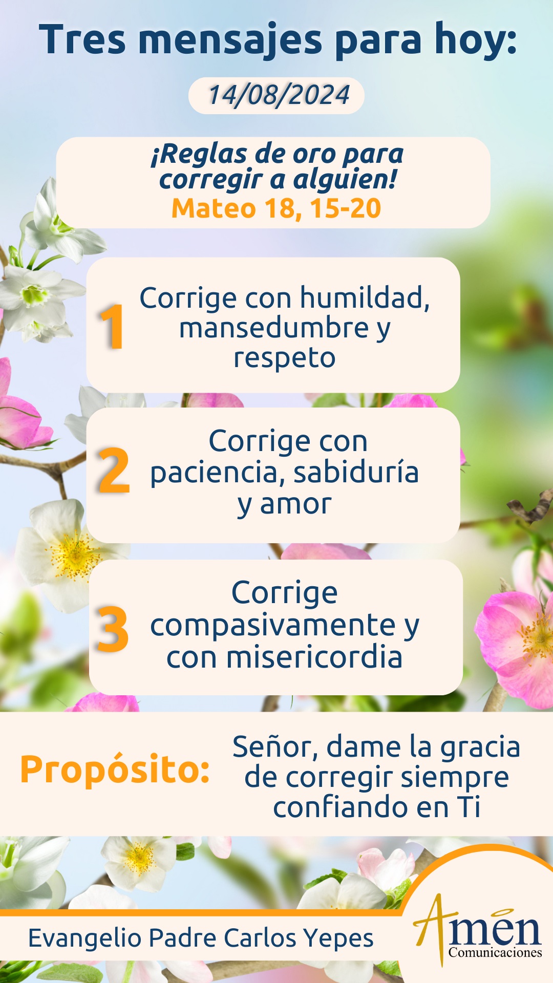 En una sexta y penúltima regla de oro encontramos, como estamos llamados a corregir con amor, sin cansarnos de amar, sin cansarnos de perdonar. Un amor que es capaz de comprender, aunque a veces por los desestímulos y por la pobre respuesta de la persona corregida quieras tirar la toalla, pero también un amor que es capaz de exigirle a los demás, un amor que sabe proteger en ciertas etapas de la vida, pero un amor también que deja volar, deja vivir, cuando toca el tiempo de volar y de vivir de manera independiente. El amor es la piedra de toque que todo lo transforma, como decía el gran padre de la Iglesia: “Ama y haz lo que quieras, y si corriges con amor, créelo que esa corrección será fecunda, porque viene de una fuente, el amor que todo lo sana, todo lo libera, todo lo redime”.