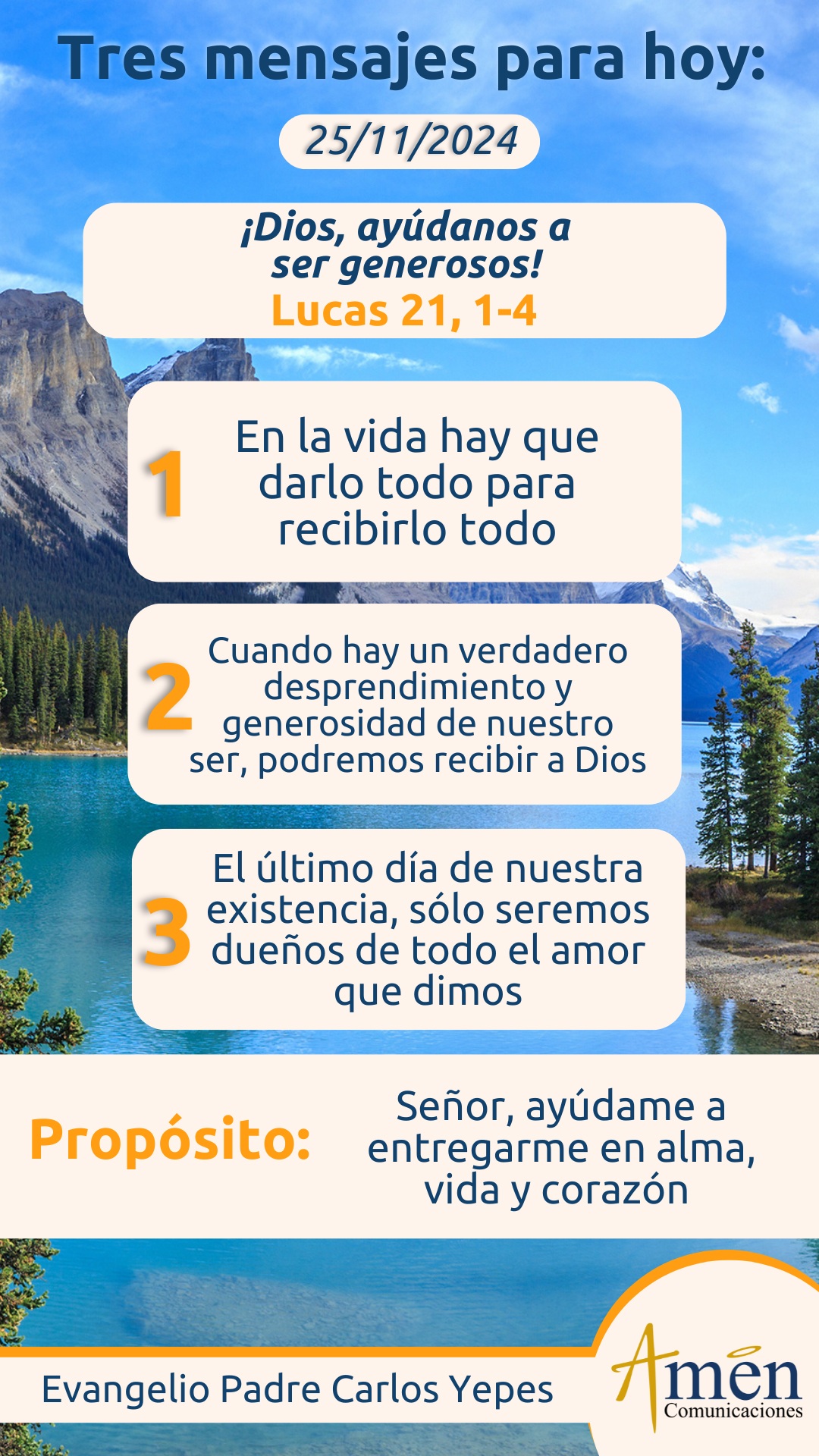 Hoy te invito para que reflexiones sobre esta realidad, sólo cuando se da abundantemente desde la escasez, cuando hay un verdadero desprendimiento total, cuando hay una generosidad absoluta de nuestro ser, podremos recibir de Dios. El común de los mortales, de los hombres y mujeres desde la abundancia dan escasamente, pero el creyente desde la escasez da abundantemente porque sabe que su seguridad, su fuerza, su existencia, no dependen de las cosas acumuladas en este mundo, sino que dependen sólo de Dios. Y a propósito de eso, te recuerdo una idea que ojalá nunca olvides, el último día de nuestra existencia no seremos dueños, recuérdalo, no seremos dueños de casas, de propiedades, de dólares, de cuentas bancarias, de bienes muebles o inmuebles; el último día de nuestra vida no seremos dueños de títulos académicos, de los viajes realizados, las comidas fabulosas, la vida sibarita. El último día de nuestra vida no seremos dueños de la fama, el prestigio, el aplauso, los reconocimientos y admiraciones, adulaciones y alabanzas humanas; el último día de nuestra vida, entiéndelo, sólo seremos dueños de todo el amor que dimos, de toda la sabiduría que compartimos, de toda la entrega que tuvimos, de todo el servicio que prodigamos, de todo el tiempo que gastamos en los demás. Es una paradoja, que mientras en el mundo, cuando se acumula dinero, la cuenta bancaria crece y cuando se retira, decrece, en la ley de Dios ocurre todo lo contrario, se multiplican las bendiciones para nuestra vida, se multiplica la gracia de Dios y los regalos divinos, sólo cuando nos donamos, nos entregamos, cuando nos damos totalmente a los demás, Presencia viva de Cristo. Nunca lo olvides, serás dueño ese último día de tu vida, no de aquello que guardaste con egoísmo, si no de aquello que entregaste con amor y generosidad.