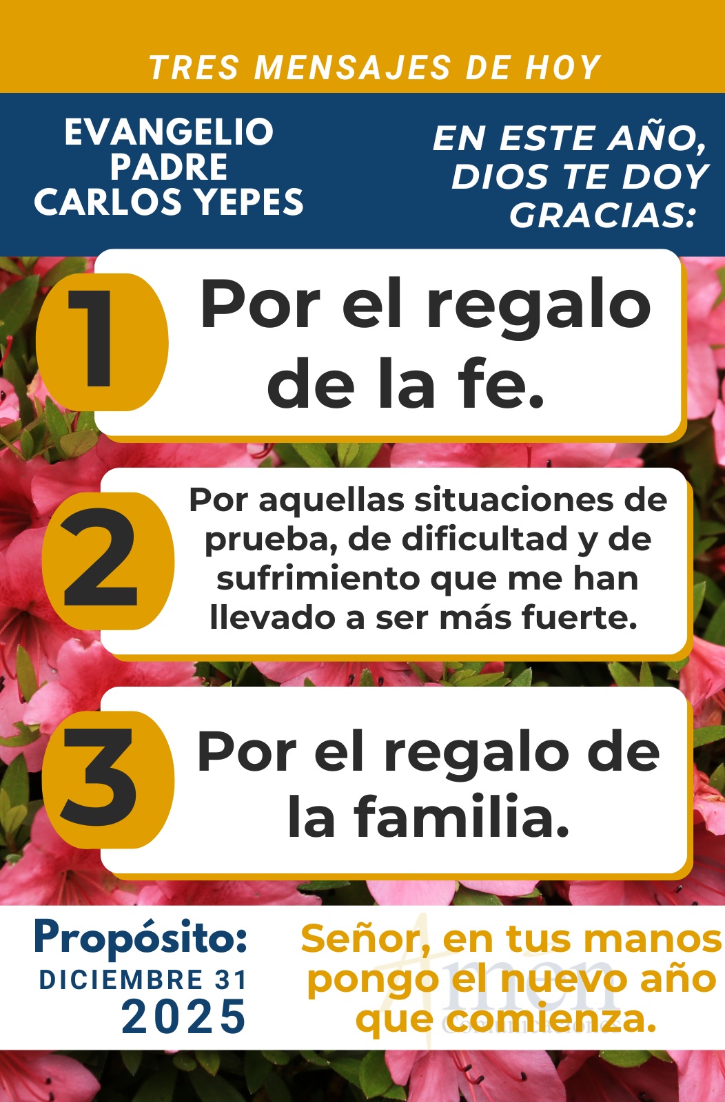 Ser mejores seres humanos, mostrar a nuestras familias, a nuestros amigos la mejor versión de cada uno de nosotros. Tener la esperanza de formar un hábito diario de oración. Así como te haces propósitos de ir al gimnasio, de dejar de comer “comida chatarra”, de comer más saludable, de levantarte más temprano; hazte el propósito de orar cada día al Señor, de sentirlo tu amigo, tu apoyo, tu guía, tu luz, el sostén en momentos de prueba, la mano del Padre que te levanta cuando te sientes caído, la esperanza de un mañana mejor, la certeza cierta de que todo va a terminar bien más allá de las pruebas dolorosas que hayas vivido o que puedas padecer en el próximo año.