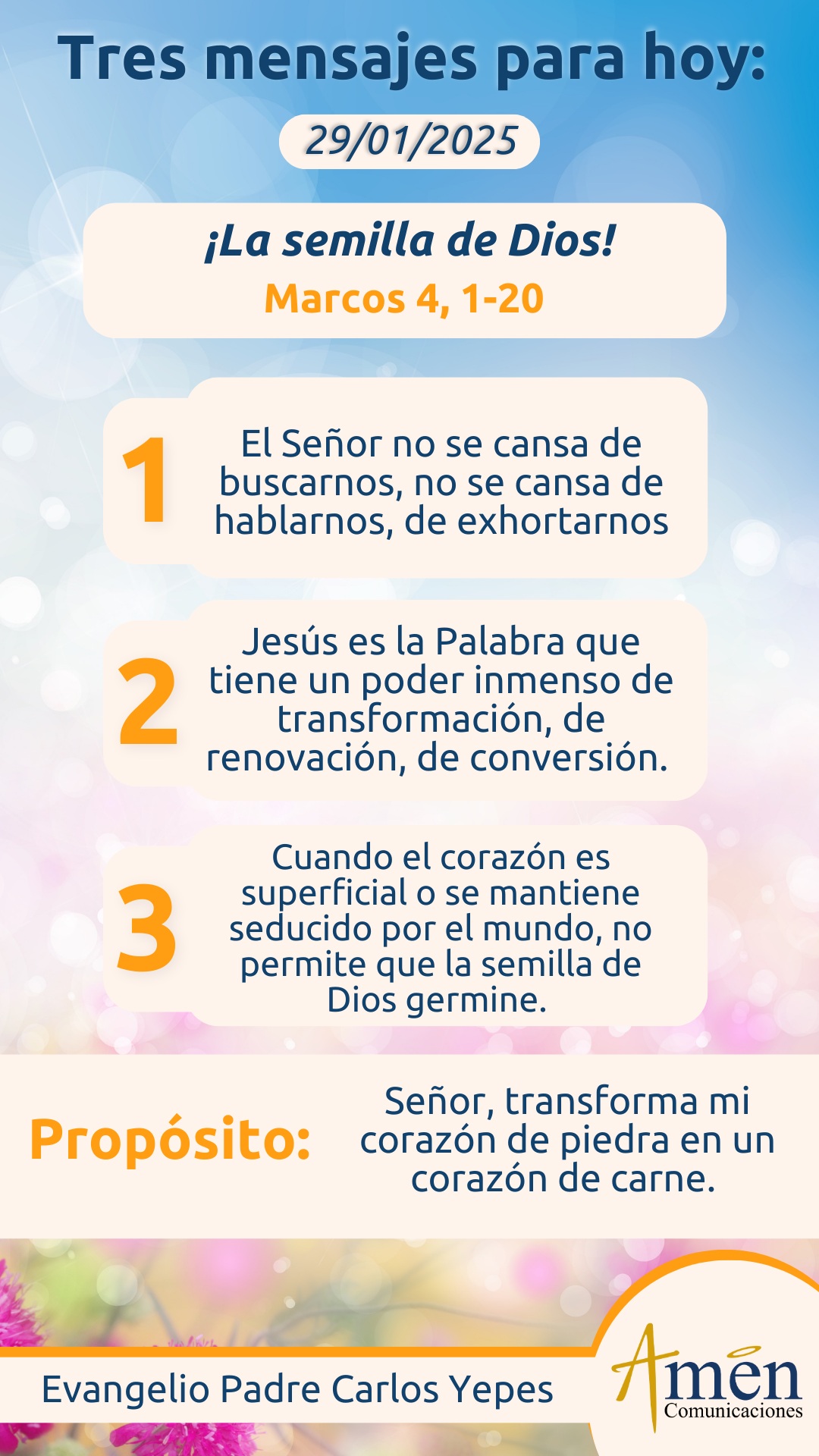 | dc.description | TRANSLITERACIÓN REFLEXIÓN PADRE CARLOS YEPES En la línea de lecturas precedentes de la carta a los hebreos, reconocemos como este capítulo, bien nos presenta que la antigua alianza, el sacerdocio del antiguo testamento, donde se ofrecían muchas veces los mismos sacrificios porque en el fondo no podían borrar pecados, es una alianza que está llamada a ser superada por el sacerdocio nuevo y definitivo de Cristo que replicamos los sacerdotes del nuevo testamento. De hecho, Cristo dirá, la carta a los hebreos en el capítulo 10: “Después de haber ofrecido por los pecados de la humanidad un único sacrificio (lo entendemos su entrega en la cruz) está sentado para siempre jamás a la derecha de Dios Padre y espera el tiempo que falta hasta que sus enemigos (habla de satanás), sean puestos como estrado de sus pies, donde colocar sus pies”. Y concluirá diciendo: “Que con una sola ofrenda, la de su vida en la cruz, ha perfeccionado definitivamente a los que van siendo santificados”. Pero sobre este tema, que ya habíamos reflexionado en días pasados, dejémoslo para otra ocasión y hablemos del texto hermoso por demás de la parábola del hombre que al voleo tira semilla en la tierra. Sabemos que a veces sembramos, pero no siempre obtenemos cosecha; aquí, a partir de una imagen de la cotidianidad, descubramos grandes enseñanzas para nuestra vida. La primera, el sembrador de la parábola evangélica, es el Señor, no se cansa de buscarnos, no se cansa de hablarnos, de exhortarnos y a partir de acontecimientos, de personas, de situaciones a veces límites, Dios no deja de cuestionar, interrogar nuestra existencia. Él va sembrando al voleo y en nuestra historia humana ella se transforma en historia de fe, historia de liberación, historia de redención, historia salvífica, Dios va obrando en el corazón humano. Pero en un segundo elemento, la semilla es la Palabra de Dios. La Palabra que es Cristo mismo encarnado, nacido en Belén y luego con su predicación, pero sobre todo con su testimonio de amor y de perdón, con sus milagros y fundamentalmente con el misterio de su Pasión, Muerte y Resurrección, Jesús es la gran Palabra que tiene un poder interior inmenso de transformación, de renovación, de conversión del corazón humano, entendiendo por éste una radical reorientación de la vida, porque hay nuevos valores, nuevos principios. Ya no será el poder, el tener dinero, el placer egoísta; sino el servicio, el amor, la libertad interior, el desprendimiento, y eso lo hace sólo la semilla de Cristo mismo en su Palabra, en sus acciones, sus milagros y en su misterio pascual. Pero descubrimos un tercer elemento y además del sembrador, que es el Señor, la semilla que es la Palabra encarnada, está la cementera o el terreno donde cae la semilla, que podríamos decir es el corazón humano, el interior personal, lo profundo del alma. Y allí se nos señala que a veces hay actitudes de esterilidad o terrenos áridos, y podríamos hablar de tres tipos de esterilidades que impiden que la semilla de Dios germine y produzca fruto en nuestra vida. Cuando el corazón es superficial y la semilla de Dios cae al borde del camino, cuando el corazón se ha endurecido por los sufrimientos, por la codicia de dinero, por el pecado personal, por la falta de amor, y es cuando la semilla cae en terreno pedregoso, esto es, entre piedras. Y finalmente, cuando el corazón se mantiene seducido, fascinado por las vanidades del mundo, los afanes del mundo, en la codicia del dinero, en el mundo. Tres tipos de esterilidad en el corazón humano que es la gran sementera o el gran terreno a cultivar por Dios, impiden que la Palabra de Dios germine. Conocerás miles de personas que han participado de Eucaristías, tal vez grupos de oración, pero luego han dicho no me interesa, no me llega, no me gusta, no tengo tiempo, estoy cansado, tengo otros asuntos para atender, ese Dios al que tú vas en la parroquia a mí no me ha ayudado para nada. Son corazones estériles porque son superficiales, no caló hondo Dios en sus vidas porque están endurecidos como piedras, porque hay dolor, amargura, pecado continuo en su corazón que los ha endurecido, o porque son corazones seducidos del mundo, de lo que habla el Papa Francisco: “La mundanidad, el dinero, las vanidades, la imagen”, y un corazón así es estéril, incapaz de entender los secretos, la sabiduría, del mensaje del evangelio contenido en la Palabra de Dios. Concluirá la parábola hablando ya no de sementeras o de terrenos estériles, sino un terreno fecundo, fértil, tierra abonada. Es el corazón humano, bien dispuesto, receptivo, abierto. Y cuando las mejores tierras en Israel daban cuánto más, cuánto más seis o siete veces lo sembrado, aquí nos habla de un poder sobreabundante y extraordinario de la Palabra de Dios, que no produce seis o siete veces lo sembrado en semilla, sino que produce 30 veces, 60 veces, 100 veces lo sembrado en el corazón humano. Esos son los santos que fueron terreno fértil, corazón abonado, y que la Palabra de Dios mereció una respuesta extraordinaria, única, disruptiva en sus vidas. Tal vez los santos fueron hombres y mujeres como nosotros, corrientes como nosotros, pero nunca fueron tibios como nosotros, mediocres como nosotros o incapaces de una respuesta más madura, más seria, más comprometida, en eso ellos se diferencian de nosotros. Señor, danos un corazón fecundo, un corazón fértil que sepa responder a la acción de tu palabra, que no se nos pase la vida fascinados o seducidos por el mundo, endurecidos por pecados, amarguras, desamor o simplemente superficiales y frívolos (los tres tipos de terrenos estériles que nos describe la parábola evangélica de hoy). Danos la gracia de ser como los santos, tierra fecunda que produzca sobreabundantemente por el poder de esta semilla divina, produzca frutos de amor y de vida nueva en cada uno de nosotros. Que el Señor te bendiga e