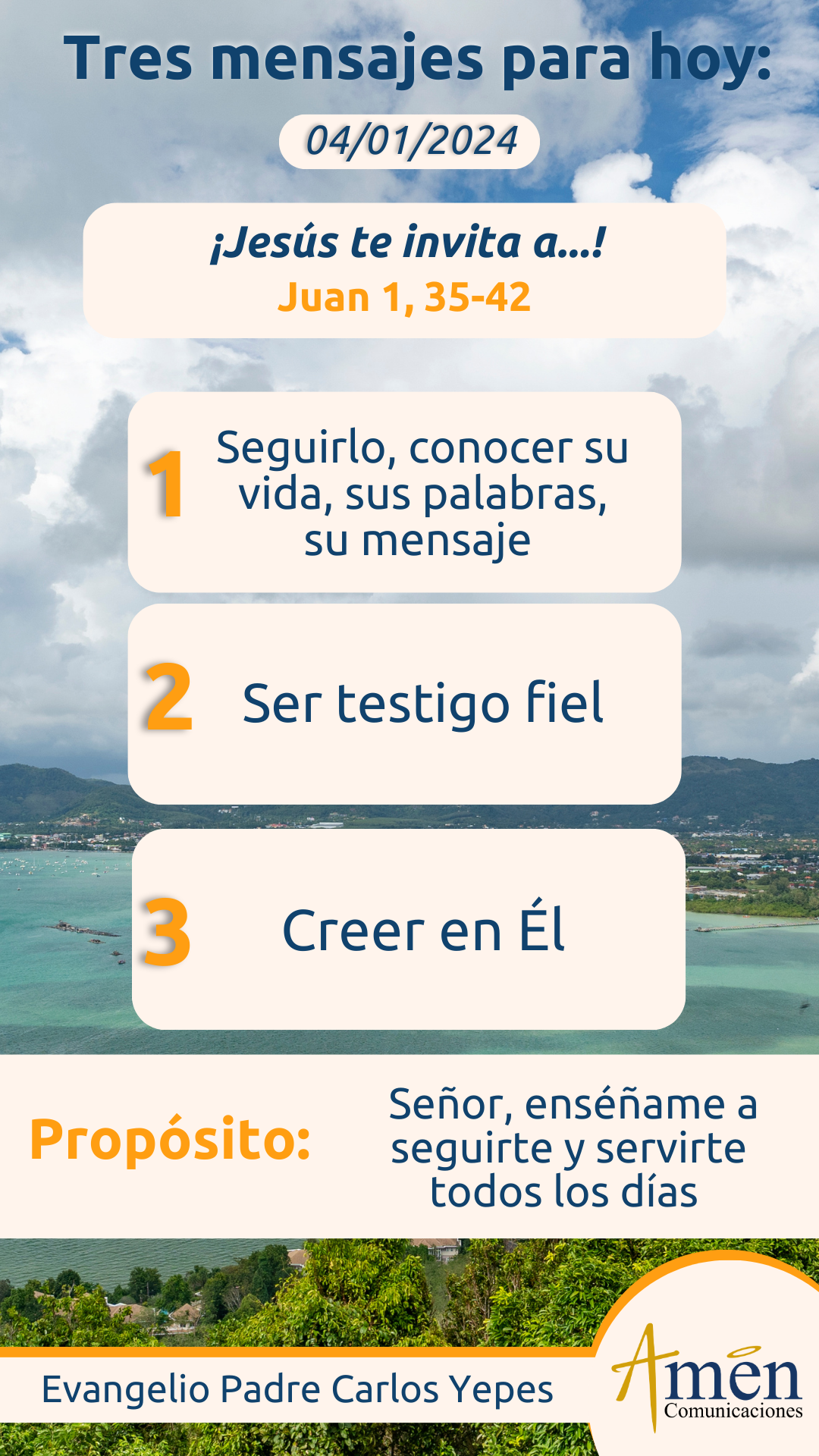 Jesús nos invita al seguimiento, al discipulado, a conocer su vida, sus palabras, su mensaje integral; más allá de un conocimiento teórico, quizás por lo que hemos escuchado de otras personas sobre la vida de Jesús, como un gran rabino, un hombre sabio que pasó por Judea hace 2000 años, venir y verlo en nosotros, ser testigos de la vida nueva que Él nos quiere ofrecer. No es solamente creer en Jesús, es creerle a Jesús, es creer en que sus palabras son vida eterna, en que en ellas no hay engaño, en que en su mensaje hay una luz universal, que no podemos encontrar en ningún mensaje de los hombres por filósofos o por especialistas en áreas del conocimiento humano, sólo en Jesús encontramos la verdad.