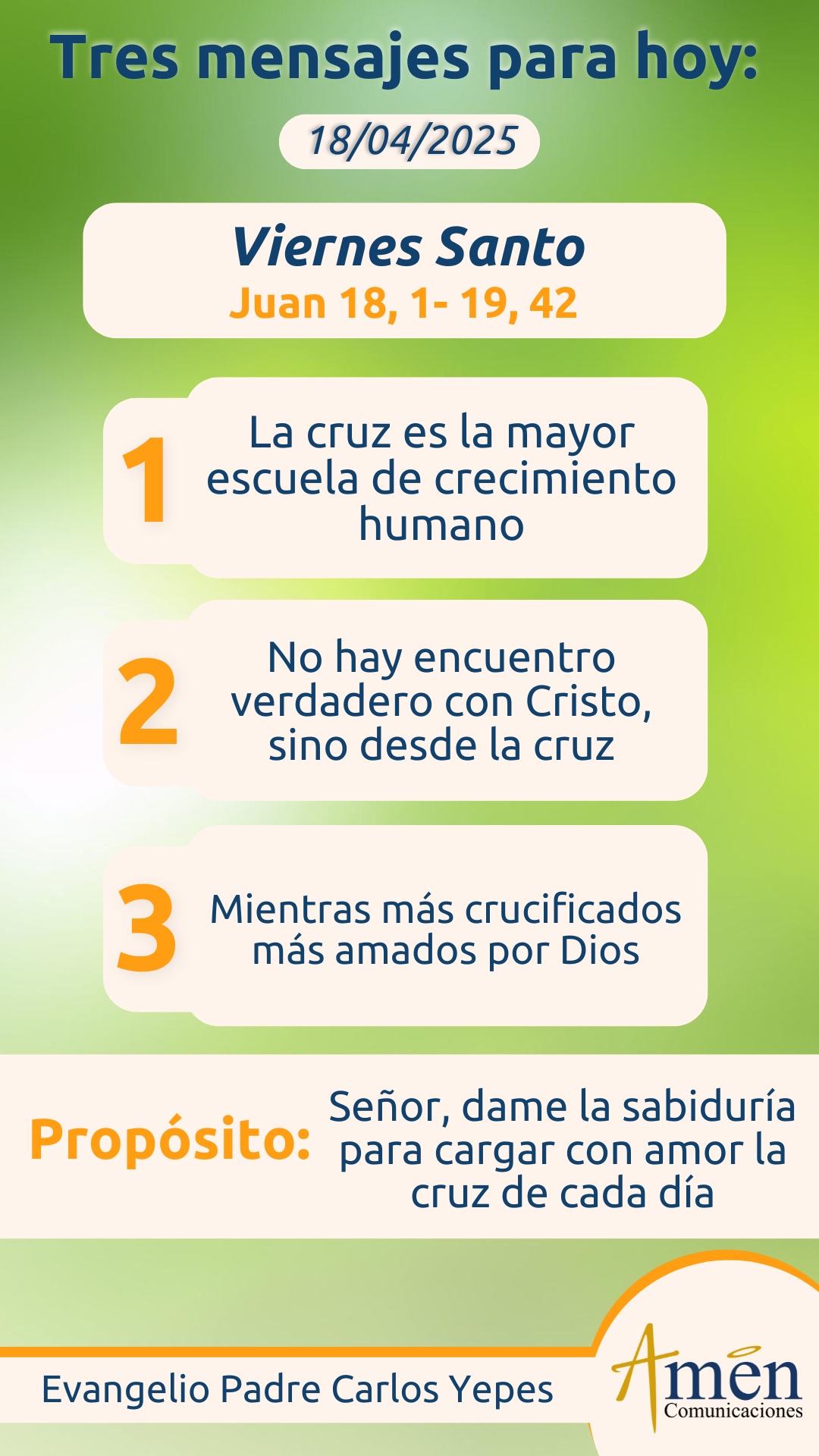 Terminemos nuestra meditación de este Viernes Santo, con una séptima y final enseñanza, descubriendo una frase lapidaria, una enseñanza eterna y universal: ¡No hay cielo sin cruz, no hay tierra prometida sin pasar primero por el desierto, no disfrutarás de la Transfiguración en el monte Tabor sin pasar por la Crucifixión en el monte Gólgota, no hay triunfos grandes en la vida sin esfuerzo, sin sacrificio y sobre todo sin morir a nosotros mismos! Recuerda, que el centro de nuestra fe nos invita a resucitar, pero antes a morir a nuestro pecado, a nuestro propio yo. Jesús coloca en el centro de su predicación, una afirmación lapidaria: “Solo el que entregue y pierda su vida por Mí y por el evangelio la salvará”.