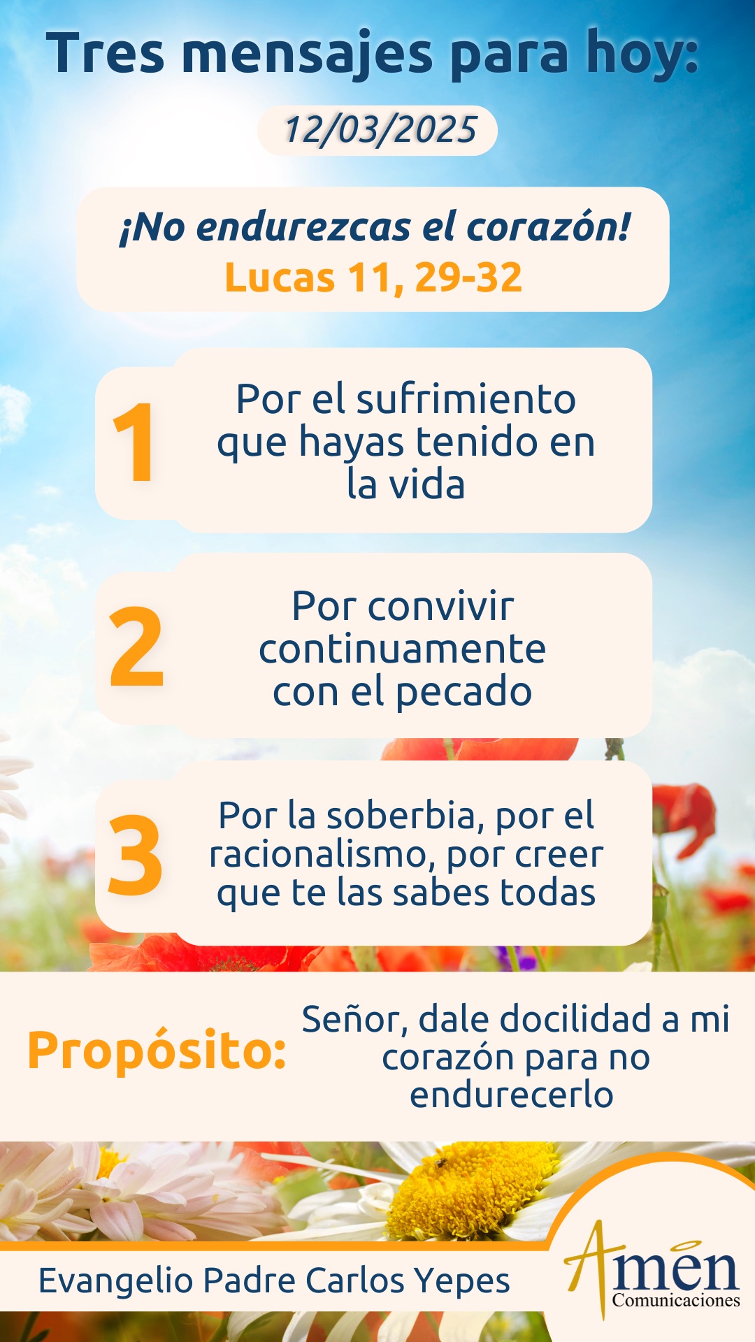 Señor, dame arrepentimiento de mis faltas, dame, Señor, dolor por mi falta de fe, aléjame de dejar endurecer el corazón por el sufrimiento, por el pecado, por la soberbia, por el racionalismo, por creer que me las sé todas, por sentirme un pequeño dios de mi propia vida. Dame, Señor, renovar en esta Cuaresma mi vida y ser un hombre, una mujer nuevos.