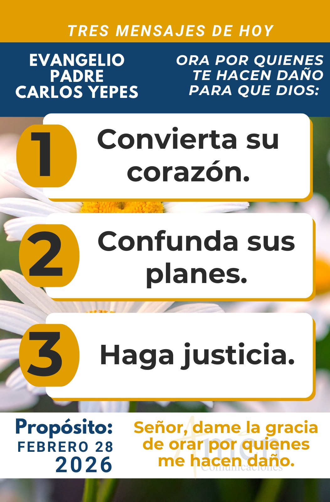 Hoy pidamos la gracia de orar y amar, a aquellos que nos han hecho daño, de entender que es un bien para nuestra vida no guardar rencores, y de comprender finalmente, que la justicia, el castigo vendrá de Dios, a aquel duro de corazón que nunca quiso cambiar su alma, convertir su espíritu, y por el contrario se empeñó en perseguir y dañar a los hijos de Dios.