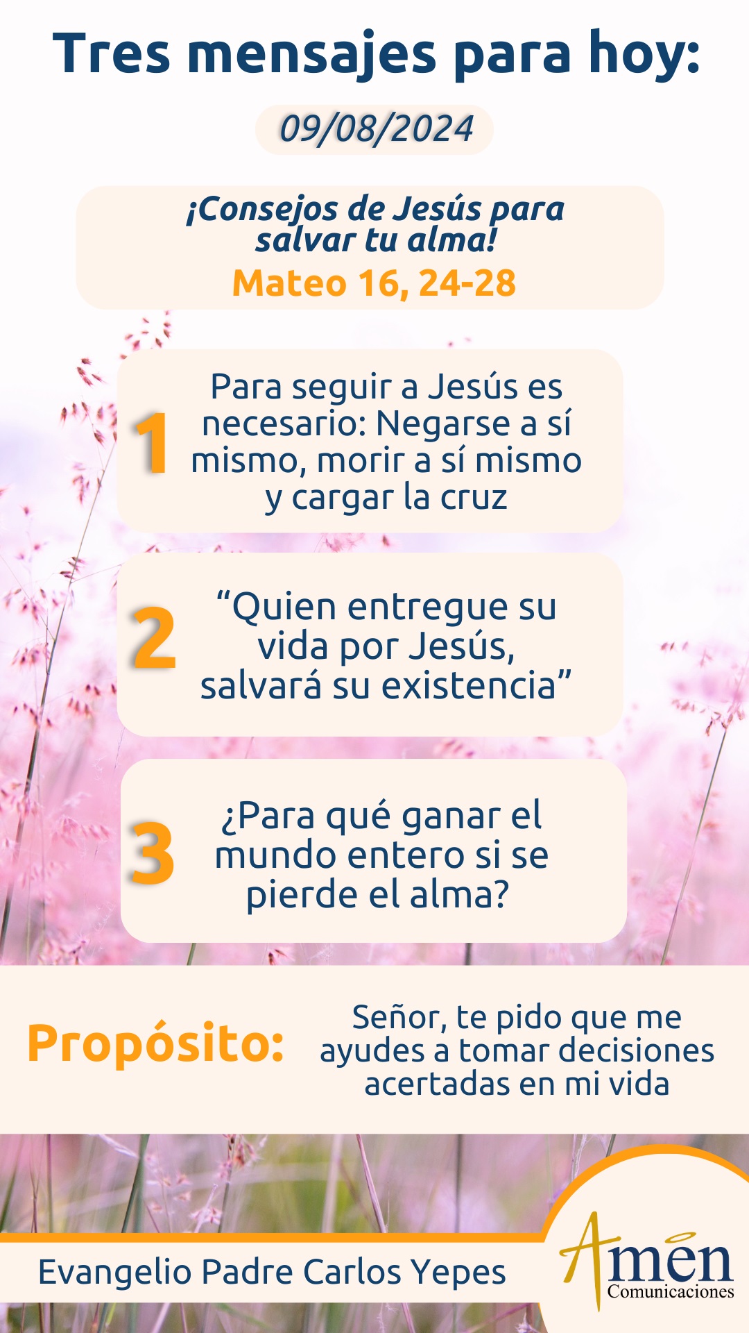 En aquel tiempo, dijo Jesús a sus discípulos: «Si alguno quiere venir en pos de mí, que se niegue a sí mismo, tome su cruz y me siga. Porque quien quiera salvar su vida, la perderá; pero el que la pierda por mí, la encontrará. ¿Pues de qué le servirá a un hombre ganar el mundo entero, si pierde su alma? ¿O qué podrá dar para recobrarla? Porque el Hijo del hombre vendrá, con la gloria de su Padre, entre sus ángeles, y entonces pagará a cada uno según su conducta. En verdad les digo que algunos de los aquí presentes no gustarán la muerte hasta que vean al Hijo del hombre en su Reino».