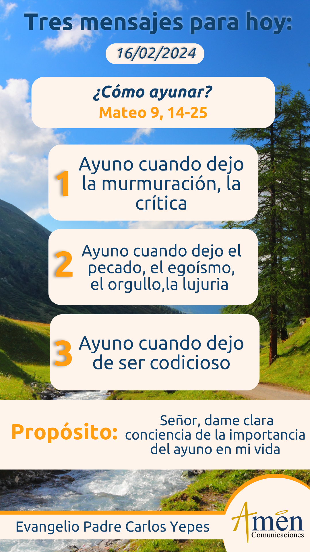 Pero de manera más amplia podríamos decir, ayunemos del pecado, adelgacemos el egoísmo que nos acompaña, no dejemos que la gula y el apetito por las comidas sabrosas, los dulces, las golosinas, nos dominen; ayuna de la pereza y fortalece tu voluntad personal, ayunar y adelgazar tu codicia de acumular y de poseer, cuando ya tienes todo en la vida asegurado, y necesitarías varias vidas para gastar lo que tienes. Que la codicia no te enceguezca; ayuna del rencor, el resentimiento contra una persona que te ha hecho daño, porque tal vez es más grande el daño que ahora te ocasiona alimentando ese resentimiento, que la acción misma dañina quizás realizada hace muchos años. Ayunemos del orgullo, que nos hace sentirnos falsamente el centro del universo y no lo somos. Ayunemos finalmente de la lujuria, que nos hace esclavos de nuestras propias pasiones, ese es el ayuno agradable a Dios, ese es el ayuno que nos purifica y por el cual alcanzaremos la misericordia divina.