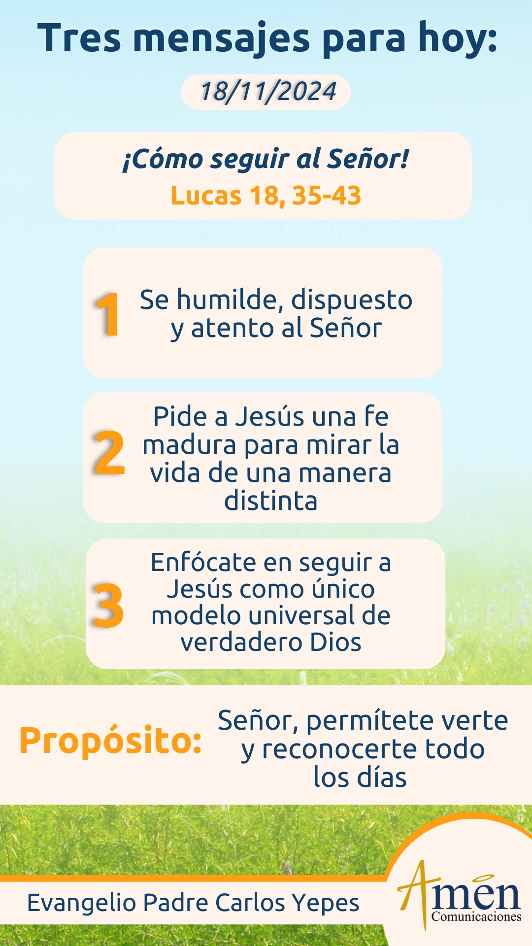 Hoy descubre que lo único esencial en tu vida es Dios y que este ciego camino de Jericó pidió a Jesús lo más importante, la sanación de su nervio óptico claro que sí, pero sobre todo la luz de la fe. ¿Hoy crees que eres sabio porque has pasado por una universidad?, ¿por qué has pasado por la escuela de la vida?, ¿por qué has conocido de la condición humana? Claro, todo esto te ha ayudado a hacer aprendizajes, pero no olvides la sabiduría más alta, buscar a Dios, conocer y experimentar a Dios, amar a Dios y de esta manera abrir la puerta de tu alma para vivir la vida plena con Dios.