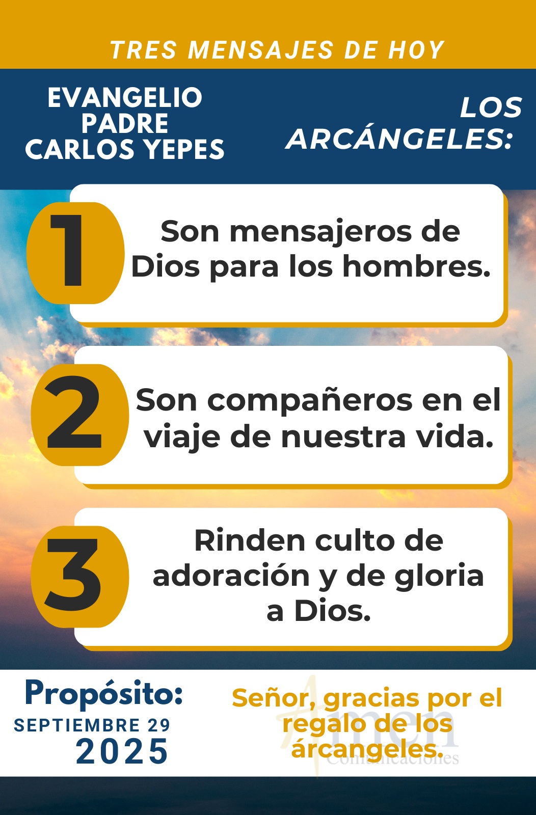 Hoy que los santos Arcángeles: Miguel, Gabriel y Rafael intercedan ante Dios por la Iglesia Universal. Hoy que los santos Arcángeles Miguel, Gabriel y Rafael desde el cielo orienten nuestras vidas. Hoy que los santos Arcángeles Miguel, Gabriel y Rafael nos ayuden a todos los hombres y mujeres de buena voluntad a ser adoradores del verdadero Dios en espíritu y en verdad.