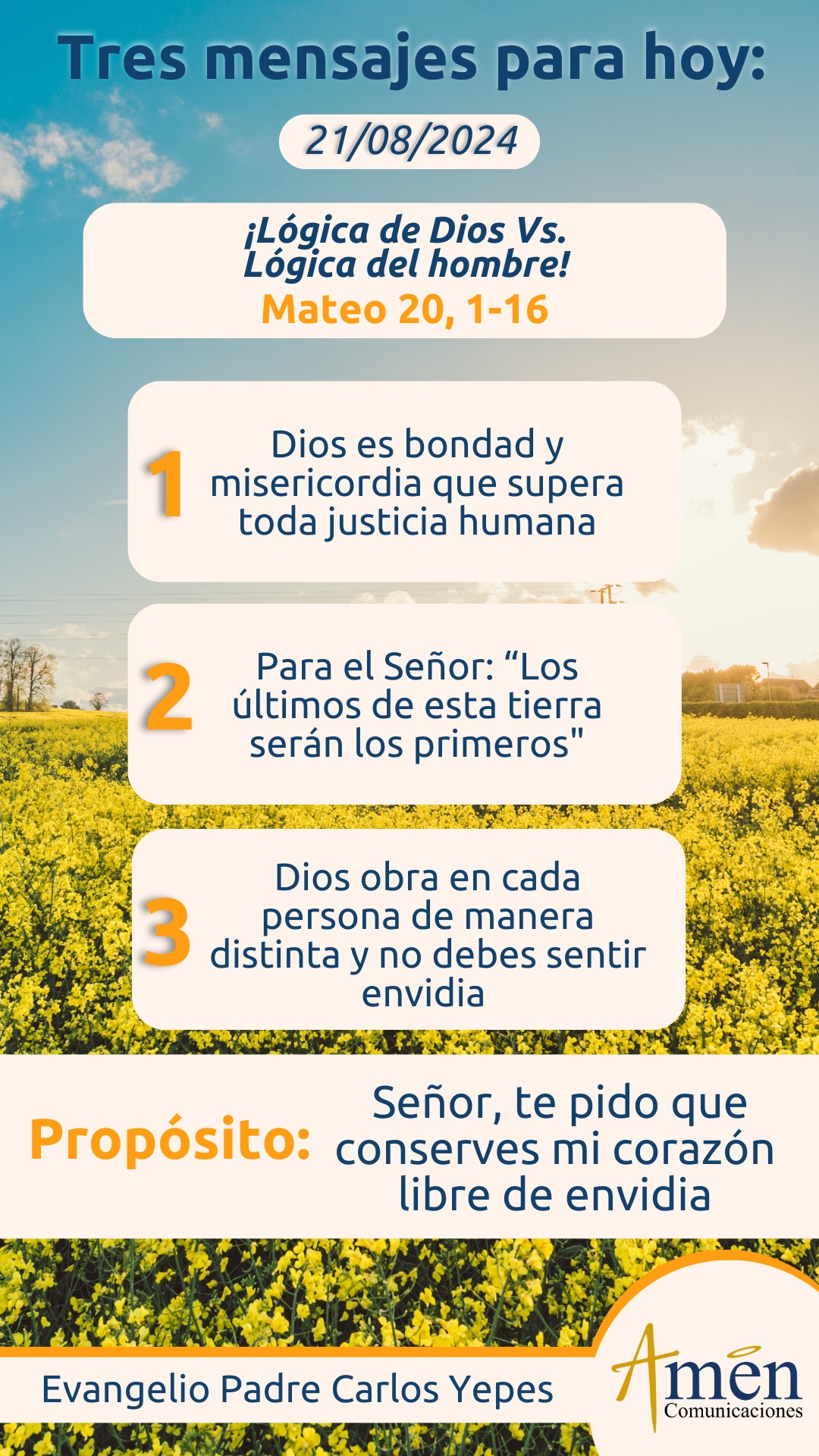 Hoy, frente a una realidad, como decimos coloquialmente o lo decían así las abuelas: “No puede ver un pobre con jíquera”, (hablando de un bolso nuevo, porque sentimos malestar, incomodidad, rabia), aprendamos que la lógica de Dios no es así. La envidia definida por algún autor espiritual: “Como la alegría por el mal ajeno o la tristeza y el dolor por el bien y la prosperidad del otro”, no deja de ser un sentimiento profundamente mezquino. Pidamos la gracia: “De no tener un ojo malo”, (como decían los hombres de la Biblia), que es el ojo de la envidia, de la rivalidad, la emulación, la competencia, porque no es así como haremos una sociedad mejor. Nos amargamos la vida comparándonos permanentemente con los demás, sobre lo que tienen y no tienen, pero, en definitiva, estamos convencidos por fe, que Dios, aunque da más talentos a unos que a otros, también les da cruces mayores, exigencias más altas en su vida, y ahí está la misteriosa justicia de Dios, que es misericordia y más alta que la justicia de los hombres y que nosotros no debemos de confrontar. Que Jesús no nos diga a nosotros como a aquellos trabajadores de la primera hora del día: “Amigo, a ti no te hago ningún injusticia”, ¿acaso no nos arreglamos, no cuadramos, no contratamos en un denario por día?, “si quiero darle a este último igual que a ti, ¿es qué no tengo libertad para hacer lo que quiera en mis decisiones?, o ¿vas a tener tú envidia porque soy bueno?”, y vuelve a repetir una máxima evangélica que hemos escuchado en otros momentos: “Los últimos de esta tierra serán los primeros y los primeros de este mundo quizá serán los últimos”, y es verdad, los contratados a la última hora fueron los primeros en recibir el denario, la salvación, la bendición de Dios para sus vidas. No nos toca juzgar, simplemente acoger en la liberalidad y en la bondad y misericordia de Dios, acoger su proyecto y su plan misterioso, así nosotros no lo comprendamos.