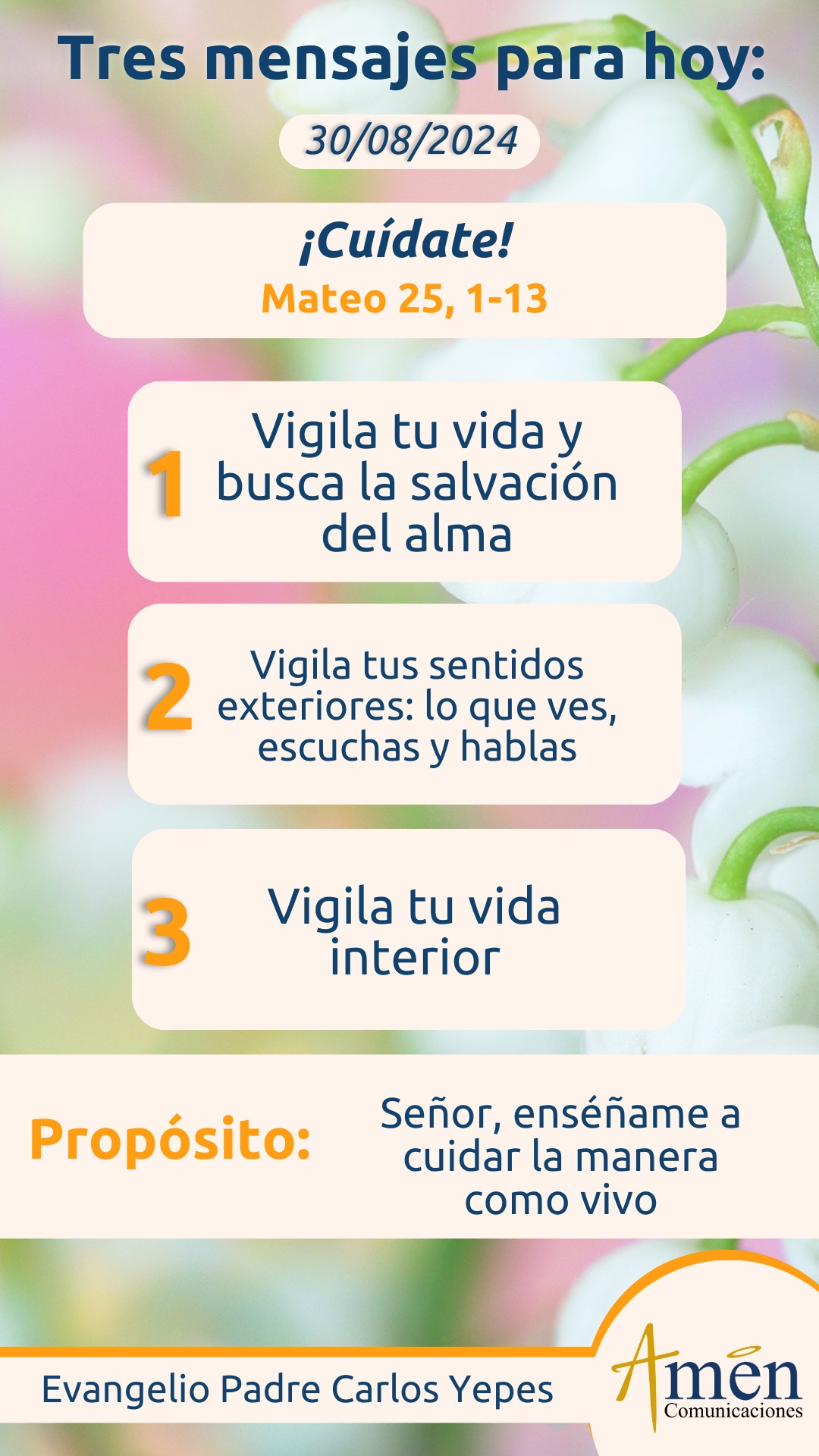 Cuida sobre tu memoria, cuida sobre lo que entiendes y como lo entiendes, muchas veces dices que te has alejado de Dios, pero no has entendido a Dios, porque no has conocido el amor de Dios y simplemente entiendes distorsionadamente a Dios, tienes una imagen deformada de Él. Cuida finalmente sobre tu voluntad, para que la pereza, la gula, el placer por el placer, no te haga un mediocre en la vida, un tibio y teniendo la misión de haberte levantado como un gran ciprés, treinta metros de altura, no fuiste más que un árbol enano con tres metros de altura, porque traicionaste la misión, la vocación de ser un gran árbol que Dios había colocado en tu vida. Vigila, vigila sobre cómo vives, que seas como la doncella o la virgen sensata, para cuando llegue el novio a medianoche, para cuando llegue el día en que el Señor se presente ante ti, puedas entrar en la fiesta del Reino de los Cielos.