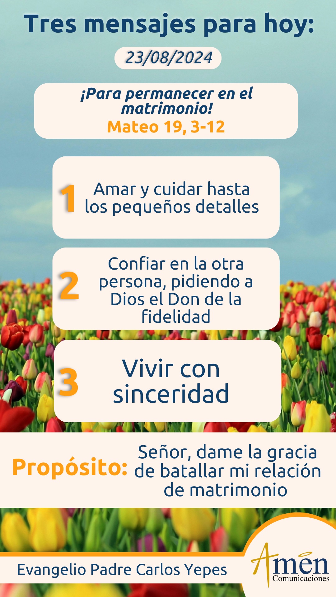 Finalmente, y por la letra d, el amor necesita ser defendido de terceras personas que pueden meterse aún sin nosotros imaginar que nos van a volver la vida un lío, hay puertas que nunca debemos abrir, porque luego no sabemos cómo cerrarlas. Es esa relación con una persona del vecindario, aquel compañero o compañera de trabajo, de estudio, aquel familiar que se metió en mi vida, movió mi corazón, me volvió a hacer sentir el fuego del primer amor, justo cuando en mi vida conyugal estaba en un momento de rutina. Debes defender el amor con la vigilancia sobre tus sentidos, sobre tu corazón, sobre exceso de confianzas, sobre exceso de conversaciones, de pronto muy hot, muy atrevidas en las redes sociales con otras personas. Hoy recordemos lo que el Señor nos dice: “Lo que Dios ha unido, no lo separe el hombre, el hombre y la mujer por el matrimonio son una sola carne”, por eso ese amor conyugal, aliméntalo, batállalo, conságralo a Dios y defiéndelo. Un auténtico a, b, c, d del amor conyugal.