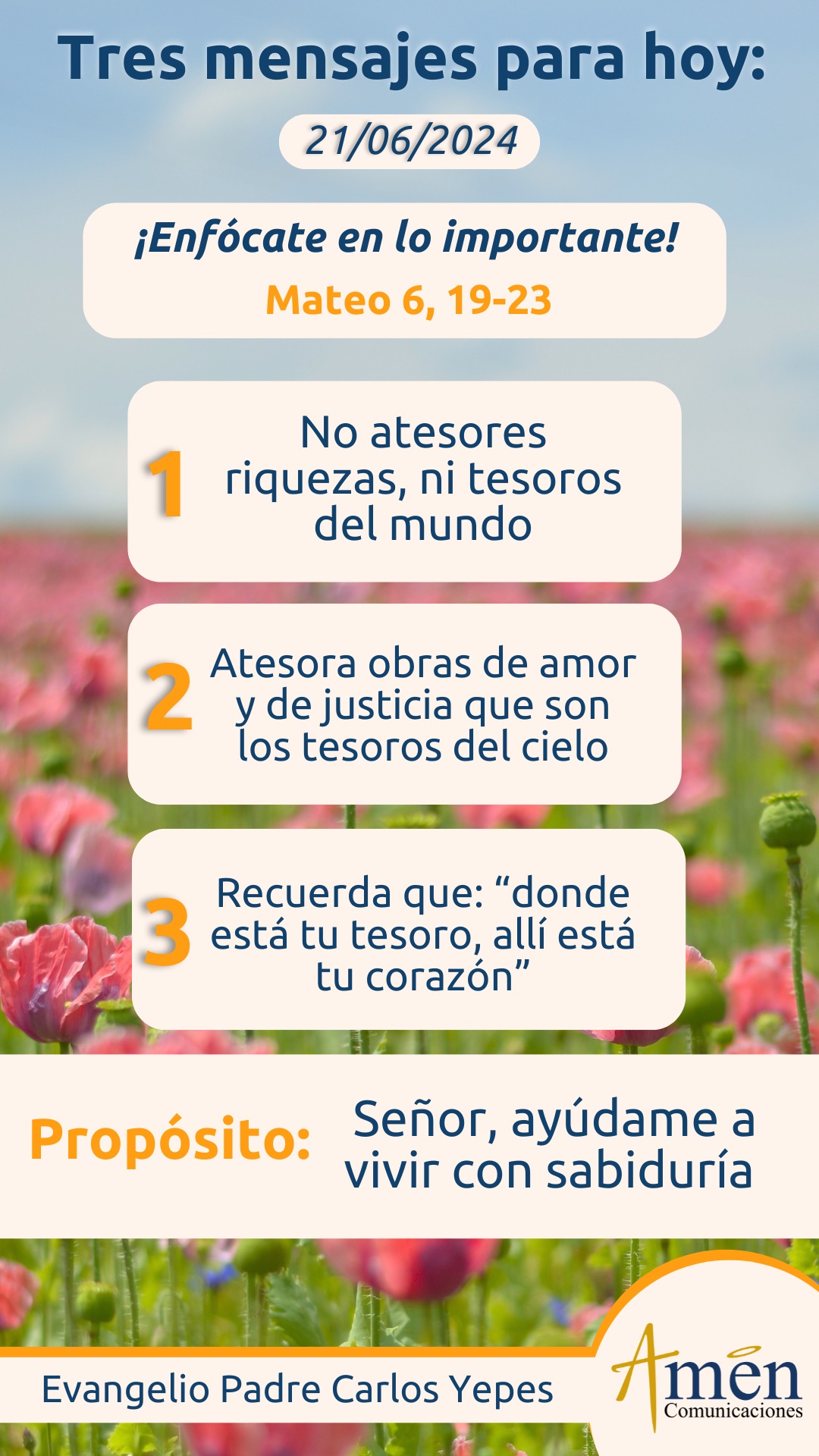 Entiende más allá del ojo la luz de la fe, el mirar con los ojos de Dios tu vida, y pregúntate sobre lo que hoy es lo más importante y esencial de tu vida, si eso se puede perder porque lo roban los ladrones o porque pasa con el decurso del tiempo. ¿Acaso no te estás engañando?, ¿acaso no estás haciendo una apuesta equivocada por tu vida?; vive con sabiduría y te reitero con todo cariño y respeto, hoy ¿dónde está puesto tu corazón?, piénsalo, actúa y vive con sabiduría.