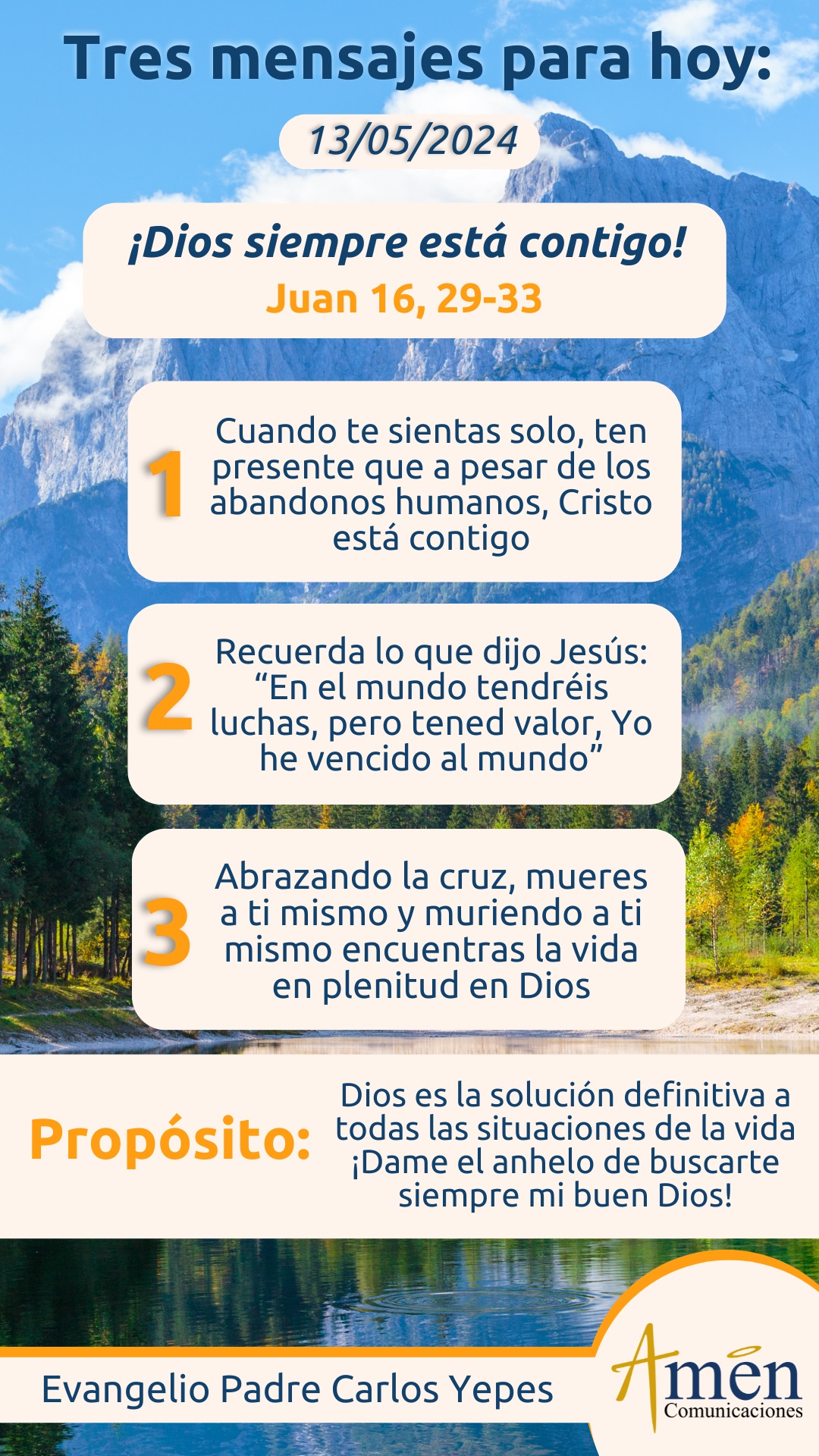 Hoy siente esa verdad, a veces te dices a ti mismo: me he cansado de batallar con mi sacerdocio, mi matrimonio, mi empresa, mi vida, la formación y educación de mis hijos; pero en un creyente no hay la palabra cansarse, no hay la palabra abandonar, no hay la palabra rendirse, porque el creyente más allá de las luchas, está llamado al coraje como nos dice Jesús: “Tened valor”, y al final concluirá con una expresión lapidaria: “Yo he vencido al mundo”. Es la victoria de la cruz, y sólo la victoria de la cruz, la que nos permite vencer el mal del mundo.