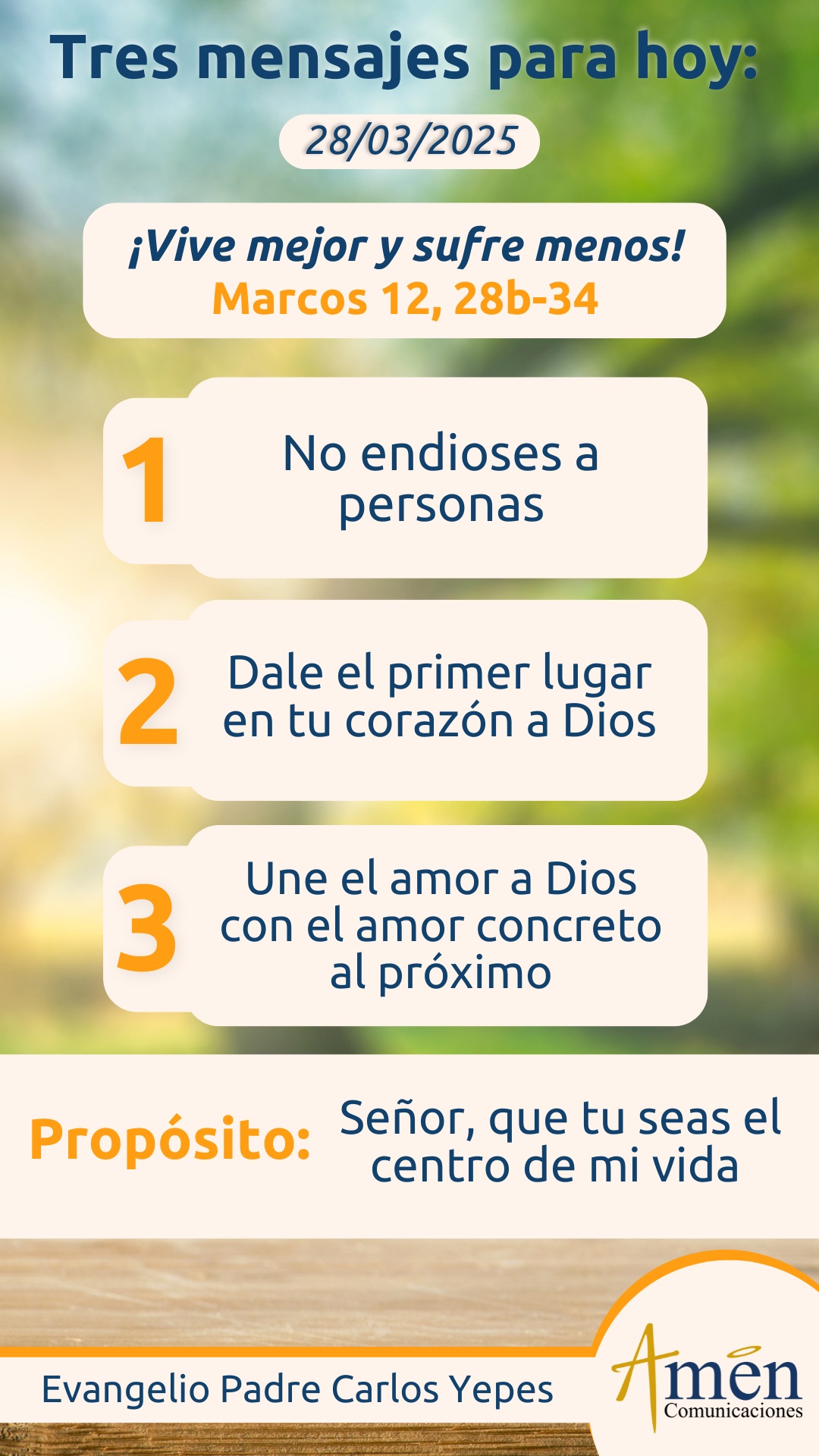 TRANSLITERACIÓN REFLEXIÓN PADRE CARLOS YEPES El profeta Oseas, hablando en nombre del Señor, clama a su pueblo: “Vuelve Israel a Dios, has caído por tu falta, no volveremos a montar a caballo, y no llamaremos ya nuestro Dios a la obra de nuestras manos. Curaré su deslealtad, los amaré generosamente, porque mi ira se ha apartado de mi pueblo, seré para Israel como el rocío, florecerá como el lirio mi pueblo, echará sus raíces como los cedros del Líbano. Brotarán sus retoños y será su esplendor como el olivo y su perfume como el de los árboles del Líbano. ¿Quién será el sabio que comprende estas cosas?, ¿el inteligente que las conozca?, porque los caminos de Dios son rectos, y los hombres justos los transitan, pero los traidores tropezarán y caerán en ellos”. Hermoso texto este del profeta Oseas, casi nos habla de manera poética invitando al pueblo de Israel (y nosotros como iglesia somos el nuevo Israel) a volver a Dios y a darle a Él el primer lugar. Con razón también en el salmo que hoy la liturgia de la Iglesia nos propone, se nos invita a reconocer: “Que cuando el triste clama en medio de sus aflicciones, Dios lo escucha y lo libra, le responde oculto entre los truenos en medio de la naturaleza”. Pero le exhorta: “No tendrás un dios extraño, no adorarás un dios extranjero, Yo soy el Señor, Dios tuyo, que te liberé de la opresión en Egipto, ojalá me escuchase mi pueblo y caminase Israel por mi camino, lo alimentaría con flor de harina, los saciaría con miel silvestre”. Este precioso salmo, nos introduce en el mensaje central de hoy que trae el evangelista Marcos, capítulo 12, cuando un escriba se acerca a Jesús y le pregunta ¿cuál es el mandamiento más grande de todos? El le dirá: “Amar a Dios con todo el corazón, con todas las fuerzas, y amar al prójimo como a sí mismo”. Aprendamos tres lecciones para nuestra vida y de entrada te diré, que encontramos en este evangelio el gran secreto de la vida para sufrir menos, vivir mejor, con más paz, con más libertad. Primera gran enseñanza práctica para nuestra vida. Muchos sufrimientos nuestros se dan hoy porque le hemos dado el lugar de Dios a quien no es Dios. Cuando tu cuerpo, tu salud, tu belleza corporal, tu prestigio o reputación, tu empresa, trabajo o emprendimiento, tus amigos o familia, cuando estas seguridades humanas ocupan el primer lugar en tu corazón y por una circunstancia sobre la cual tú no tienes control, tu cuerpo ya no es bello, tu salud no te acompaña, tu reputación se ha venido a menos, la empresa está en quiebra, tus amigos se ausentan, tus familiares van muriendo. Cuando sientes que estas seguridades fallan, sientes que la vida se derrumba, que todo se viene abajo. Hoy piensa en los sufrimientos actuales de tu vida y muy probablemente muchos de ellos se dan con ocasión que le has dado el primer lugar en tu corazón, el primer lugar en tu vida a realidades humanas, a circunstancias terrenales, a personas que van y vienen, y no puedes hacer depender tu seguridad existencial, tu paz interior y tu plenitud de vida, de tu salud que hoy es y mañana no es, de la reputación que puede cambiar, de la belleza corporal, de si está bien la empresa, de si tienes dinero o no, de si tu familia está amorosa o ha cambiado, si tus amigos están cercanos o te han traicionado. No le des el primer lugar a ninguna realidad del mundo que va y viene, que es cambiante, caduca, engañosa. Pero te presento una segunda enseñanza conclusiva de todas las lecturas de hoy. Y es que el primer amor a Dios, darle el primer lugar en tu corazón a Dios que no falla, no se ausenta, no se acaba, no traiciona, no se muere. Cuando le das el primer lugar en tu corazón a Dios, estás construyendo una fuente de paz, una fuente de seguridad existencial, un hontanar de alegría, de fortaleza y de esperanza cierta, porque Dios es el Dios del siempre y el nunca: “Siempre te acompañare, nunca te abandonaré”. Este es un salto cualitativo que es muy sutil, porque mucha gente dice de labios para afuera que Dios ocupa el primer lugar en su corazón, pero su gran afán es hacer dinero, cuidar su familia, mejorar su casa, tener para el viaje de vacaciones, atender a su salud, y entonces lo de Dios, en primer lugar, es mera teoría, palabras que se lleva el viento, pero no una realidad. Te repito que cuando hay ese salto cualitativo, sincero, real, verdadero y tú dices, Dios ocupa el primer lugar en mi corazón dirás: ¿yo de qué me preocupo si es mi Padre, mi creador, mi Hacedor, mi todo, la fuerza de mi vida, quien me sostiene, en quien esta afincada, enraizada o sostenida mi existencia?, ¿por qué voy a tener miedo?, ¿por qué me voy a angustiar? Voy a dejar de preocuparme, voy a dejar de sufrir, voy a vivir mejor. Practícalo y créeme que a todos nos pasa, no tenemos control sobre todas las variables de nuestra vida: esperábamos no enfermarnos y nos enfermamos, esperábamos que esta persona tan querida no se muriera y se murió, esperábamos que las ventas de la empresa mejoraran y no mejoraron, esperabas que no te ibas a divorciar y te divorciaste. No tienes el control de todas las variables de tu vida, pero sí te afincas, si te fundas, te construyes sólo en Dios, Él siempre permanece, Él nunca falla, Él no se ausenta, Él no se muere, Él siempre te ama y si eso lo vives de verdad ¡cuánta paz, ¡cuánta alegría y cuánta esperanza! Terminemos con una tercera enseñanza, y es que la gran revolución de Jesús y nos lo presenta en este evangelio, es equiparar, es unir el amor primero a Dios con el amor concreto al próximo, al prójimo, al cercano. Es que no hay verdadero amor a Dios sin amor al prójimo, lo contrario es una fe cristiana falseada, aparente, de nombre, pero no es real. Cuando el escriba le dice: “Que entiende muy bien que amar a Dios con todo el corazón, con todo el entendimiento, con todo el ser y amar al prójimo como a sí mismo vale más que cualquier