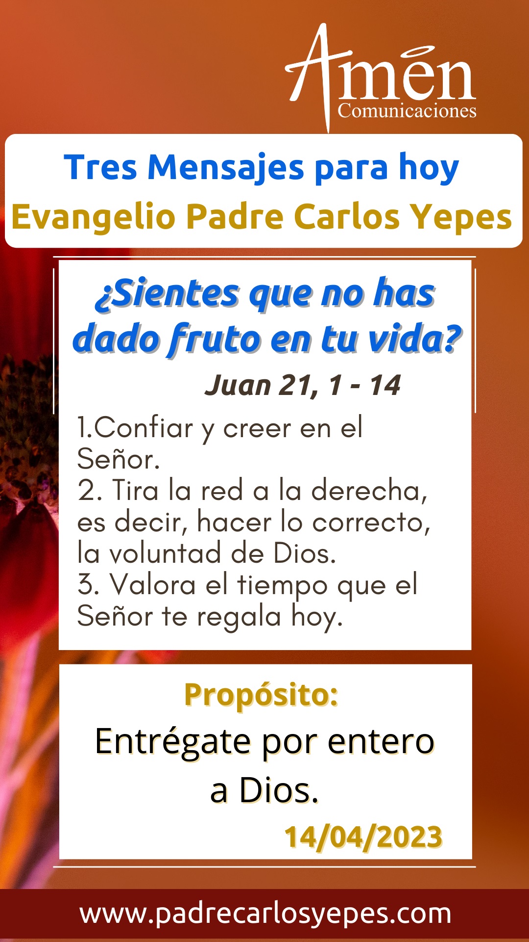 Jesús les dice: “Tiren la red a la derecha” y después de una pesca infructuosa hay tal cantidad de peces, que los apóstoles apenas podían arrastrar la red. Ellos están impresionados, nos habla de una pesca sobre abundante 153 peses, un número simbólico que nos habla de la cantidad de especies de peces conocidas en el mundo antiguo. Pero más allá de todo esto ¿qué podemos concluir para nuestra vida?; cuántas veces, en momentos de iluminación interior decimos: ¿qué he hecho de mi vida, qué frutos he producido en el matrimonio, en el trabajo, con los amigos, con la familia? y sentimos que hay cierta esterilidad, hay una infecundidad, que no hemos obtenido frutos, ni una pesca abundante para la vida; es el momento ya no de confiarnos en nosotros mismos, en nuestros criterios humanos, sino de confiarnos y creer en el Señor, y tirar la red a la derecha esto es del lado correcto, del lado del bien, del lado bueno y encontraremos pesca abundante, frutos que jamás imaginábamos en nuestra vida. Hoy te invito para que sientas la alegría, de buscar frutos y resultados solo apoyados en el Señor.