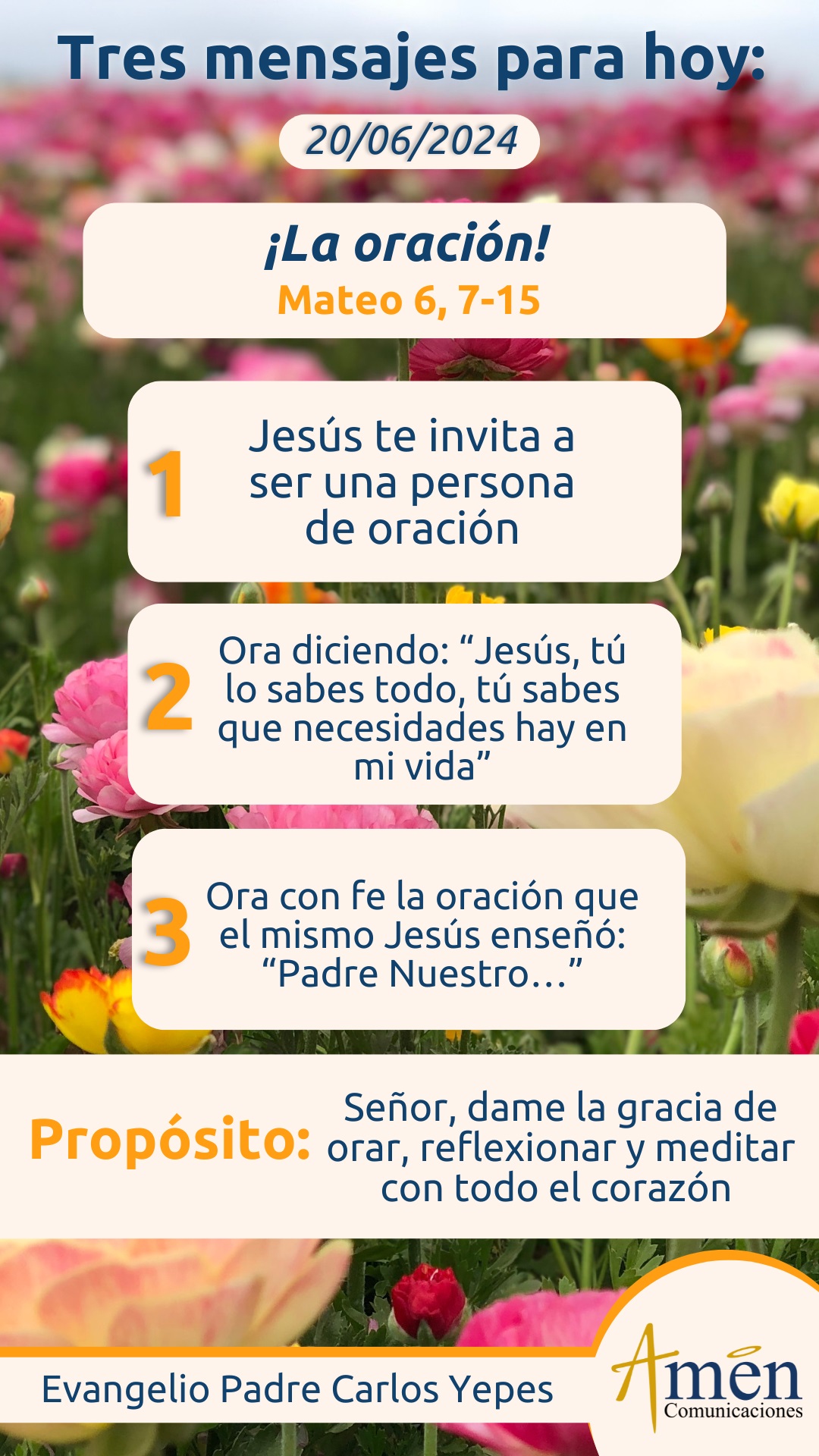 -Cuando recéis no uséis muchas palabras como los paganos, que se imaginan que por hablar mucho les harán caso. No seáis como ellos, pues vuestro Padre sabe lo que os hace falta antes que se lo pidáis. Vosotros rezad así: