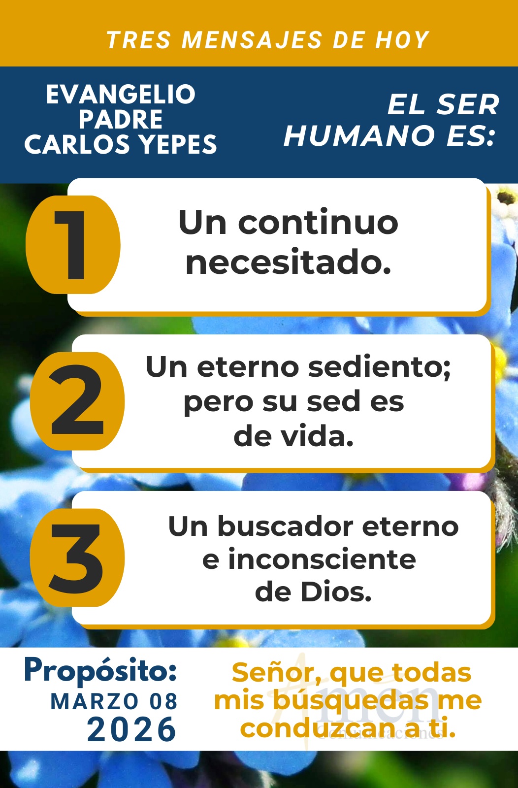 TRANSLITERACIÓN REFLEXIÓN PADRE CARLOS YEPES ¡Sedientos de vida y de amor! Más allá del encuentro de Jesús con la samaritana en el pozo de Jacob, y más allá de saciar la sed, más allá de la carga simbólica que tiene este Evangelio de san Juan en la narrativa, dónde nos muestra muchos elementos para descubrir, como hay que adorar a Dios en espíritu y en verdad y como el hombre se puede entregar a la idolatría, pero puede conocer a Jesús y la verdad profunda que Él presenta; descubramos tres elementos centrales y pastorales para nuestra vida. El primero, el hombre es un continuo necesitado. Todo ser humano rico o pobre, letrado o ignorante, el hombre del pasado o el de hoy, es un continuo necesitado de comer, de beber, de dormir, de respirar; todos estamos de alguna manera dependiendo de aquellos materiales o alimentos congruos para cada día. Pero descubrimos en un segundo momento que esa hambre o esa sed del hombre, es más profunda que simplemente atender o mitigar un hambre o sed material o fisiológica. Descubrimos en ese sentido y en un segundo momento, que el hombre es un eterno sediento; pero su sed es más profunda que de simple agua del pozo de Jacob, es una sed de vida. De alguna manera reconocemos siguiendo al gran padre de la Iglesia san Agustín, que este encuentro de Jesús y la samaritana, es el encuentro de la sed de Dios con la sed del hombre; ¡es que Dios tiene sed de que el hombre tenga sed de Él! Muy en el fondo reconocemos que la quinta palabra de Jesús en la cruz: “Tengo sed”, no es solamente una sed material, es una sed de que el hombre busque de Dios, de que el hombre busque saciar sus anhelos más profundos solo en Dios. Y es aquí donde viene una tercera y fundamental enseñanza. Más allá de la sociedad divertida, la sociedad consumista, la sociedad de la materia, del espectáculo y de las modas que hoy vivimos, reconocemos que en cada ser humano más allá de su raza o lengua, hay una búsqueda eterna e inconsciente de Dios, por vía de sustitutos o de compensaciones, buscamos la seguridad, la alegría, el amor de Dios en las seguridades materiales, las alegrías pasajeras, el amor humano que a veces queremos comprar y a veces mendigar. Al final de la vida descubrimos que estamos llenos de nada y vacíos de todo y que el vacío de nuestro corazón tiene exactamente el tamaño de Dios. ¿Pero cuál es la sed profunda del hombre de hoy nos preguntamos? Y señalamos sencillas líneas o iluminaciones. Hoy en el corazón humano hay una sed de vida, de vida abundante. Es que tenemos una vida extensiva hacia afuera, pero no intensiva hacia adentro, nos falta más pasión y motivos para darle sentido a la vida. Hay también en una segunda iluminación, una sed de amor, olvidamos que fuimos creados por Dios para amar y ser amados y tenemos tantos huecos en el alma que llenamos mal; hay en nosotros una soledad acompañada de cosas muertas. Hay hoy día tantos matrimonios rotos, familias de extraños, dónde nos une la tecnología y la mascota del perro o del gato que hemos comprado; no nos damos cuenta que no nos queremos y no recibimos el amor de otros. A veces descubrimos con dolor que el amor humano da poco y a veces pide mucho, y el amor de Dios da mucho y pide poco. En una tercera iluminación descubrimos, que en el hombre de hoy hay una sed de paz, es el gran don de Dios que se nos da con el nacimiento de Jesús y con la Pascua, la Resurrección de Jesús al decirnos: ¡La paz les doy! En el ser humano encontramos una búsqueda frenética para descansar, para salir de weekend o fin de semana al campo, para desconectarnos de la carga, del hastío, del tedio de la vida. Hoy tenemos una necesidad universal de perdón y de reconciliación con nosotros y con los otros, pero esa paz y esa reconciliación la da solo Dios y no las cosas humanas. En una cuarta iluminación, hoy encontramos sed de justicia, decimos que la vida es injusta pero no es la vida, somos los hombres los injustos, solo Dios puede hacer justicia, pero quiere hacer justicia a través de tus manos, a través de tus capacidades, a través de tu voz, a través de hombres convertidos. En una quinta iluminación, descubrimos que el ser humano hoy tiene sed de alegría, el hombre busca alegrar la vida en la amistad, en la comida, en el vino, en el deporte, en la música, en el baile, en el descanso, para aligerar las tristezas y el peso de la vida; pero olvidamos que la alegría más profunda está cuando Dios mora en mí, esto lo entendieron claramente los santos que vivían gozosos más allá de las adversidades. En una sexta iluminación, descubramos que en el hombre de hoy hay sed de la verdad, búsqueda de honestidad, de transparencia, de una información imparcial, de una mayor confianza en las relaciones afectivas y comerciales. Estamos cansados y hastiados del engaño y de la manipulación, y olvidamos que solo Cristo es la verdad y que por el camino del Cristo verdad, nos haremos libres. En una séptima y última iluminación, descubramos que la gran sed del hombre es una sed de infinito, de eternidad, de inmortalidad; nos resistimos, nos revelamos contra la muerte. Buscamos perpetuarnos en hijos, buscamos perpetuarnos en la empresa que hemos formado, busca el artista perpetuarse en su obra de arte y olvidamos que solo Cristo ofrece vida eterna. Hoy reconocemos, que somos eternos buscadores a lo largo de la vida, pero buscamos ese amor, esa paz, esa justicia, esa alegría, esa verdad, esa infinitud, esa vida abundante, la buscamos en las cosas caducas y finitas del mundo y solo lo encontramos en otro infinito, Dios. Recordemos como conclusión de esta reflexión, la famosa expresión del padre de la Iglesia san Agustín: “Señor, nos hiciste para Ti y nuestro corazón andará inquieto en este mundo hasta que no descanse en Ti”. Que el Señor te bendiga en este día. En el nombre del Padre, y del Hijo, y del Espíritu Santo. Amén.