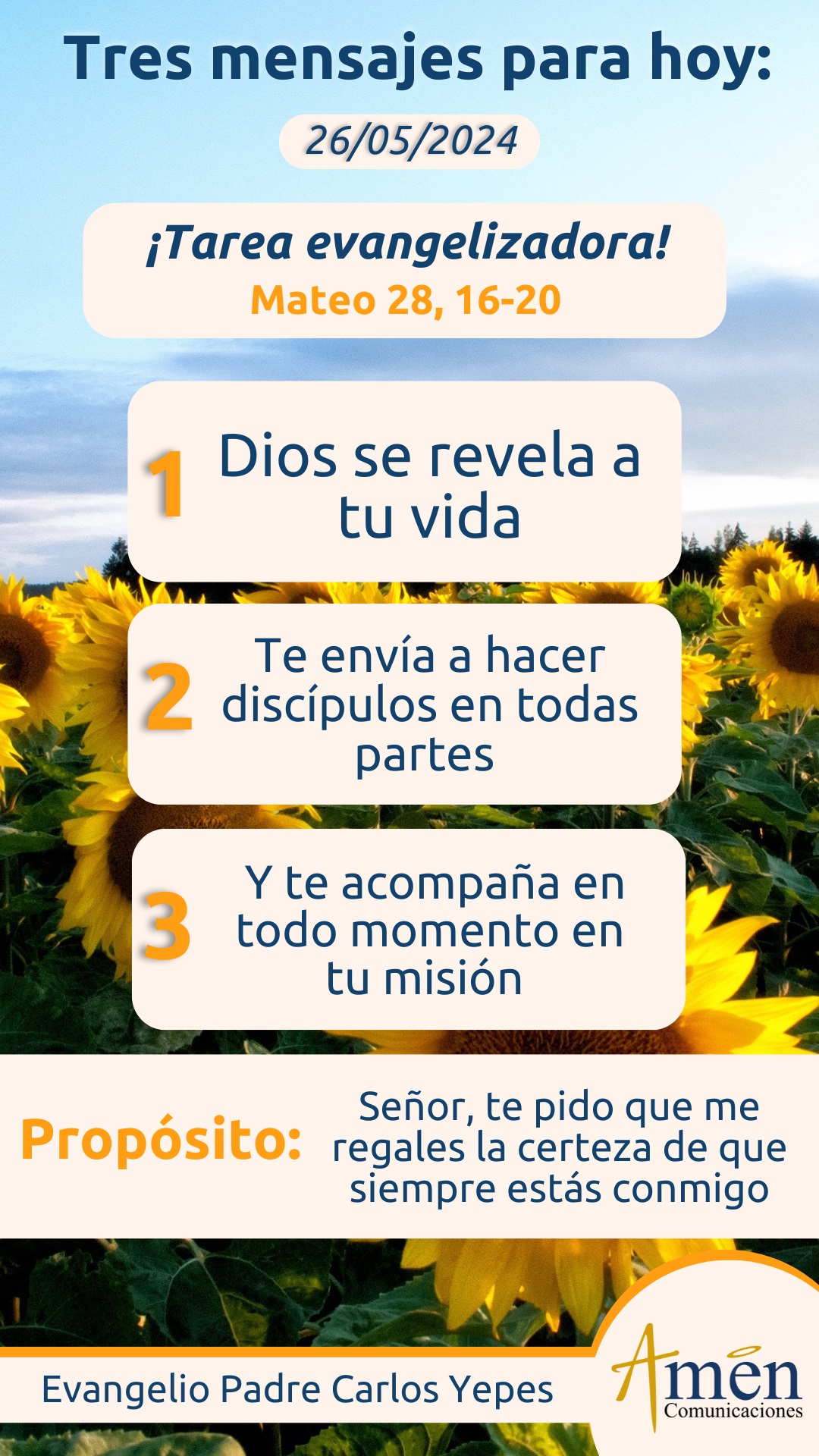Hoy a la Santísima Trinidad, le clamamos que nos ayude a entender la revelación del Dios todo poderoso manifestado en Jesús, el envío misionero que nos invita a ser discípulos de todas las personas que conozcamos y la promesa de la protección y la asistencia del Espíritu Santo, que va a estar con nosotros todos los días hasta el final de los tiempos.