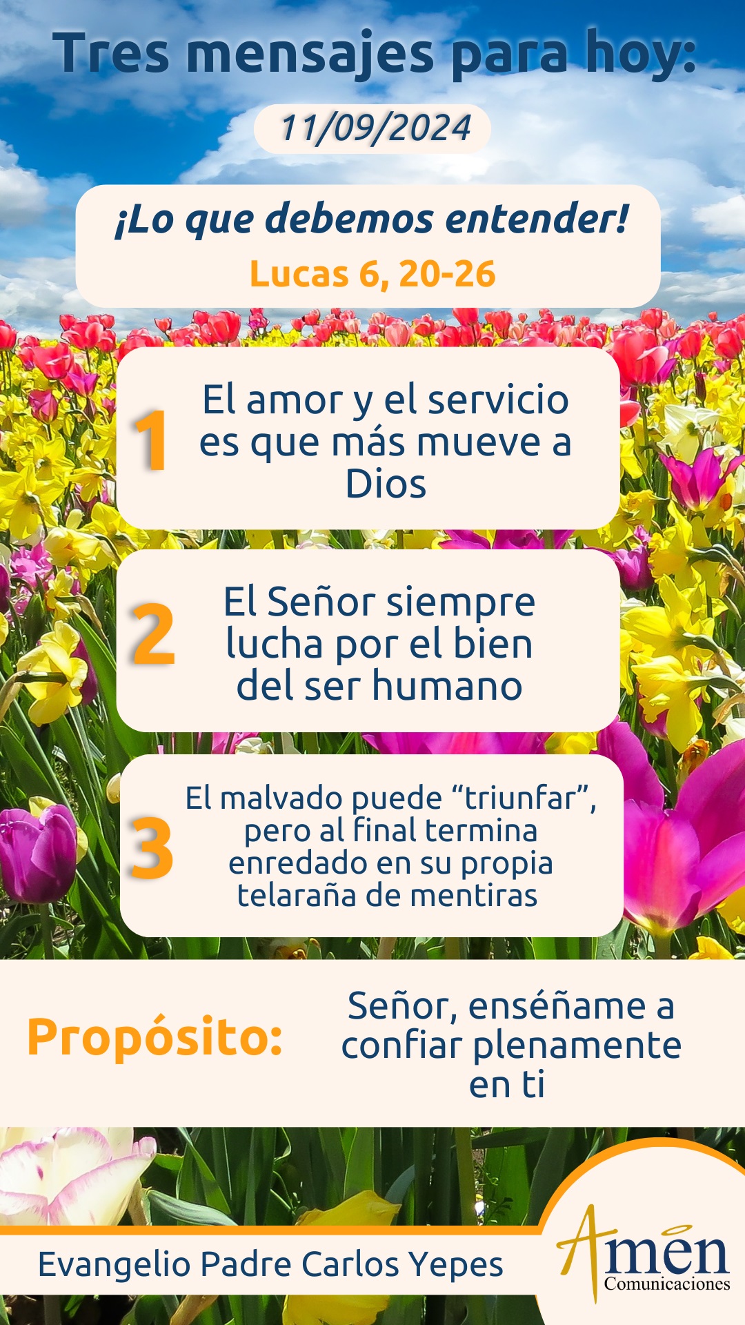 Pero podríamos agregar una tercera enseñanza y final, y es que, acogiendo la voluntad divina sin desesperarnos, por más que haya sufrimientos pasajeros, al final la obra de Dios no deja de realizarse, y como dice también el texto bíblico muy citado por los refranes de los abuelos: “Dios escribe derecho y escribe historia de salvación en renglones torcidos”, los renglones de injusticia, de cizaña, de intriga, de trampa que hay en los seres humanos. Créeme, ya no estoy tan joven, acercándome a los 31 años de vida sacerdotal y te lo digo con conocimiento de causa, el malvado por más que aparentemente triunfe, al final termina enredado en su propia telaraña de mentiras, de intrigas, de codicias, de calumnias, de cizaña. Y, por el contrario, el hombre justo, aunque parezca abandonado de los hombres y del mundo, al final siempre es exaltado, levantado amorosamente por las manos providentes del buen Dios.