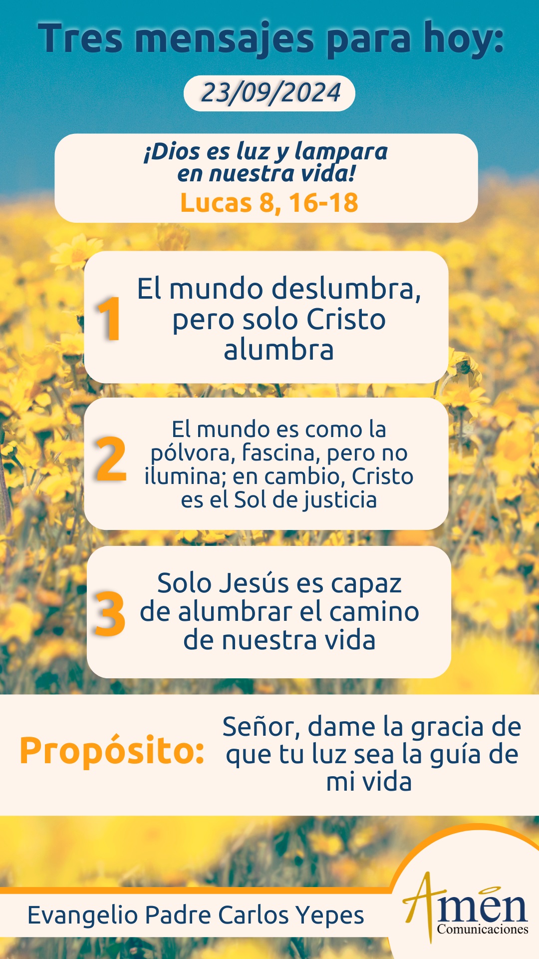 Hoy pensemos, que la luz que tenemos nosotros por el Espíritu del Resucitado, está llamada a ser irradiada. Pero siento que a veces los creyentes, manejamos complejos de inferioridad, falsos respetos humanos, cobardías y miedos que nos impiden expresar a la familia, a los amigos, en el círculo laboral, nuestra fe en Cristo y hablar de las maravillas que Dios ha hecho en nuestra vida, de cómo nos ha levantado en momentos en que hemos estado caídos, de cómo nos ha sanado y nos ha protegido de peligros inminentes.