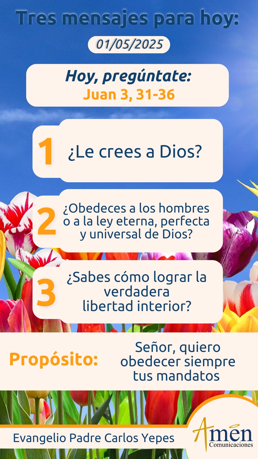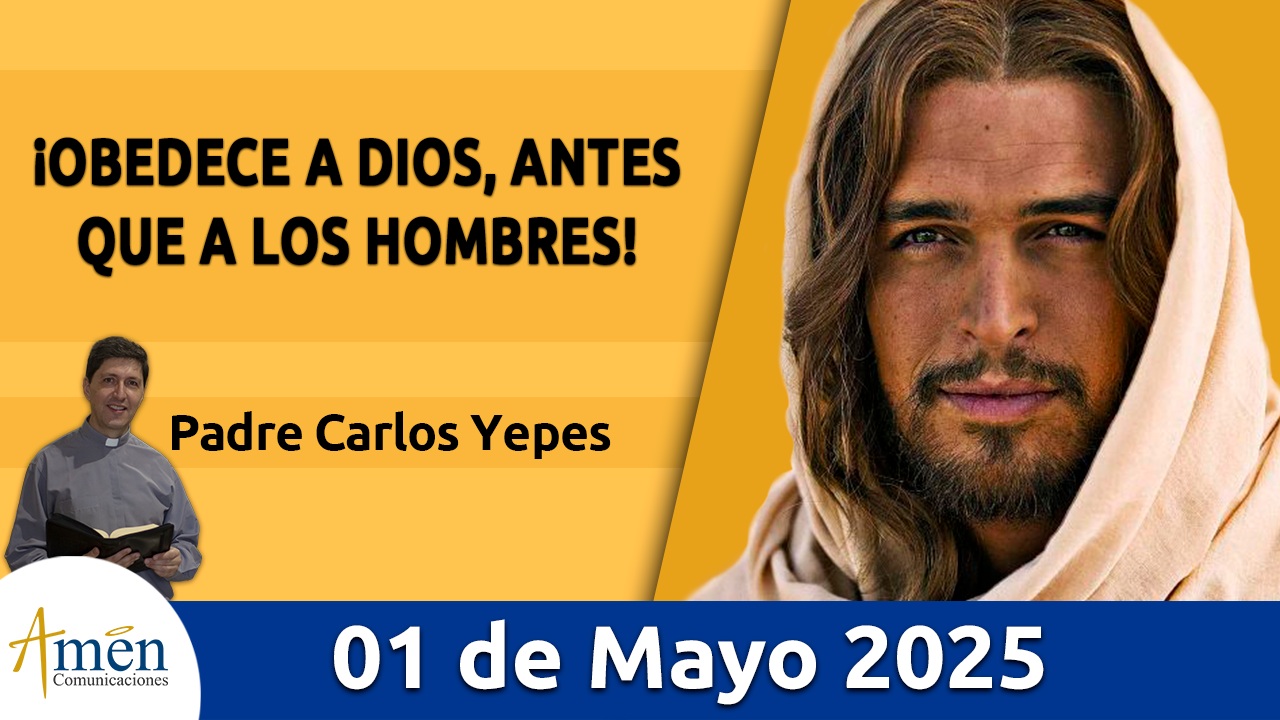 TRANSLITERACIÓN REFLEXIÓN PADRE CARLOS YEPES En la memoria litúrgica de San José Obrero, (patrono de todos los trabajadores honestos en el mundo entero, que se ganan el pan material con el sudor de su frente), meditemos en los textos por demás muy decientes que nos presenta la liturgia en este día. En efecto, la primera lectura tomada de Hechos de los Apóstoles, capítulo 5, nos muestra cómo el sumo sacerdote interroga al grupo de apóstoles o enviados por Jesús y cómo los cuestiona amargamente, diciéndoles: “Que se les ha prohibido que en la ciudad de Jerusalén enseñen formalmente el nombre de ese (con ese desprecio, con esa manera despectiva de hablar de Jesús que ni siquiera mencionan su nombre), hablan de la prohibición expresa de Jesús, de hablar de Él después de su Muerte al grupo de los apóstoles”. Sin embargo, Pedro, con gran parresía, con gran coraje y con gran libertad interior, afirmará: “Hay que obedecer a Dios antes que a los hombres”, y de alguna manera, recapitulando lo que llamamos el kerigma evangélico, el núcleo mismo del mensaje del evangelio, hablan: “De como Jesús fue colgado en el madero de la cruz, muerto en este lugar. Pero Dios lo ha exaltado con su poder, haciéndolo jefe y salvador para la conversión y el perdón de los pecados para todos”. Y luego concluye el apóstol Pedro de manera magistral: “Testigos de este acontecimiento de la Resurrección de Jesús somos nosotros y el Espíritu Santo, que Dios da a los que le obedecen”. Detengámonos un momento en esta expresión, cuando todos buscamos el Espíritu Santificador, el Espíritu Maestro interior, el Espíritu Paráclito que intercede, auxilia, sostiene nuestra vida, nos dice claramente el apóstol Pedro: “Que sólo se recibe el Espíritu Santo y sólo se da a aquellos que obedecen totalmente a Dios”. Hoy nos preguntamos ¿nuestra primera obediencia es a la ley de Dios o a las leyes de los hombres? Hoy nos interrogamos interiormente ¿si somos de alguna manera demasiado respetuosos, con falsos criterios humanos?, ¿acatamos falsos respetos humanos?, ¿nos dejamos conducir por el pensamiento políticamente correcto o el pensamiento políticamente mandado? Hoy te cuestiono en tu vida, preguntándote, ¿tú obedeces leyes inmorales o hay objeción de conciencia de tu parte por un criterio ético, un criterio religioso, un criterio filosófico y dices respetaré la vida de un no nacido, respetaré la santidad del matrimonio, por más que leyes inicuas, corruptas, me hablen en sentido contrario? Hoy pregúntate si le crees a Dios antes que creerles a los hombres, porque en el fondo descubrimos que en nuestra sociedad tan hiperconectada y donde se universaliza la comunicación merced a las llamadas redes sociales en el mundo digital, a veces por miedo a la crítica digital, al cuestionamiento social, podríamos decir, al bullying, somos demasiado obedientes a los hombres olvidando la suprema obediencia a la ley eterna, perfecta y universal de Dios. La vida me ha enseñado que quien con humildad no obedece a Dios, con humillaciones termina obedeciendo a cualquier pobre hombre que es miserable como tú, que se equivoca como tú, que se enferma como tú, que se muere como tú; pero a veces, dictadores, bravucones, líderes que alardean de su poder, de su prestigio y les damos tanta importancia y les prestamos tanto respeto humano, y olvidamos que la verdadera libertad interior se da sólo por el camino de la obediencia a la Ley de Dios, que repito, es sabia, universal y perfecta. No temas de alguna manera desobedecer a los hombres cuando sientes que ellos no representan la voluntad de Dios y que curiosamente en la desobediencia a algunos líderes de la sociedad moderna, en la desobediencia a ellos está la obediencia a la voluntad y a la Ley de Dios. En el fondo, San José, más allá de ese aspecto del hombre trabajador, honrado de la madera, artesano con sus manos, es el hombre espiritual, el hombre fraterno, el hombre de comunión, el hombre libre sin dependencias, el hombre de paz interior, pero sobre todo San José es el hombre que supo obedecer a Dios antes que a los hombres y tomar por esposa a María, más allá de las leyes religiosas rituales de la época, que mandaban de manera clara y taxativa que si una mujer tenía un hijo antes de contraer matrimonio, debía de ser repudiada, debía de ser rechazada. José por la fe y avisado en sueños por un ángel o mensajero de Dios, obedece a Dios antes que las leyes aparentemente santas y perfectas de los judíos, y así cumple el plan perfecto de Dios. Hoy te invito para que venzas falsos respetos humanos, para que te declares libre frente a tantos criterios insensatos que la cultura nos va presentando. Y a veces un hombre con sindéresis, con criterio claro, dirá, “estamos en los tiempos del mundo al revés, donde el mal es llamado bien, donde el bien es calificado de mal, donde lo bueno se mira como torcido y lo torcido se mira como recto, donde el dulce se mira como amargo y el amargo se mira como dulce”. Hoy, “en los tiempos del mundo al revés”, aunque puedas vivir incomprensiones humanas, recuerda la famosa expresión de Jesús cuando dice: “Quien se avergüence de mí en este mundo, Yo me avergonzaré de él en el Reino de los Cielos”, y en sentido contrario, dirá Jesús: “Quien cumpla hasta la última tilde o letra de la ley, será el más grande en el Reino de los Cielos”. No te importen críticas de hombres que van y vienen defectuosos como tú, equívocos como tú, falibles como tú; no endioses a ningún hombre, no endioses a ningún líder, no endioses a ningún artista, no endioses las redes sociales, no endioses el criterio del mundo, lo políticamente mandado, porque allí normalmente no está siempre la verdad. Jesús fue un hombre que tomó distancia frente al pensamiento de su época, fue un judío marginal y aunque vivió incomprensiones y persecuciones, también entendió, como 