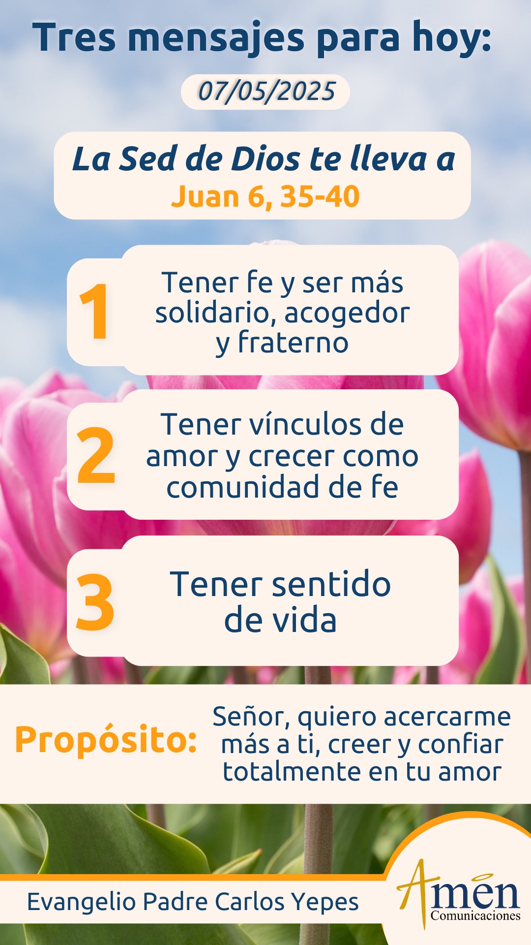 La primera, como hemos dicho en evangelios precedentes, el hambre y la sed que nos habla el evangelio de hoy no es solamente una sed material u orgánica, es una sed más profunda, es una sed existencial. En todo ser humano hay un hambre y una sed de comunión, de unidad entre todos. En los partidos de fútbol en un estadio, en las manifestaciones políticas en las calles, en eventos de conciertos de grandes artistas, en el fondo, inconscientemente, el ser humano busca comunión, fraternidad, a ser unidad con otros. Lo que pasa es que el equipo de fútbol, la ideología política o el artista en el concierto nocturno no alcanza a generar una unidad o una comunión de vida tan profunda como la genera Jesús.